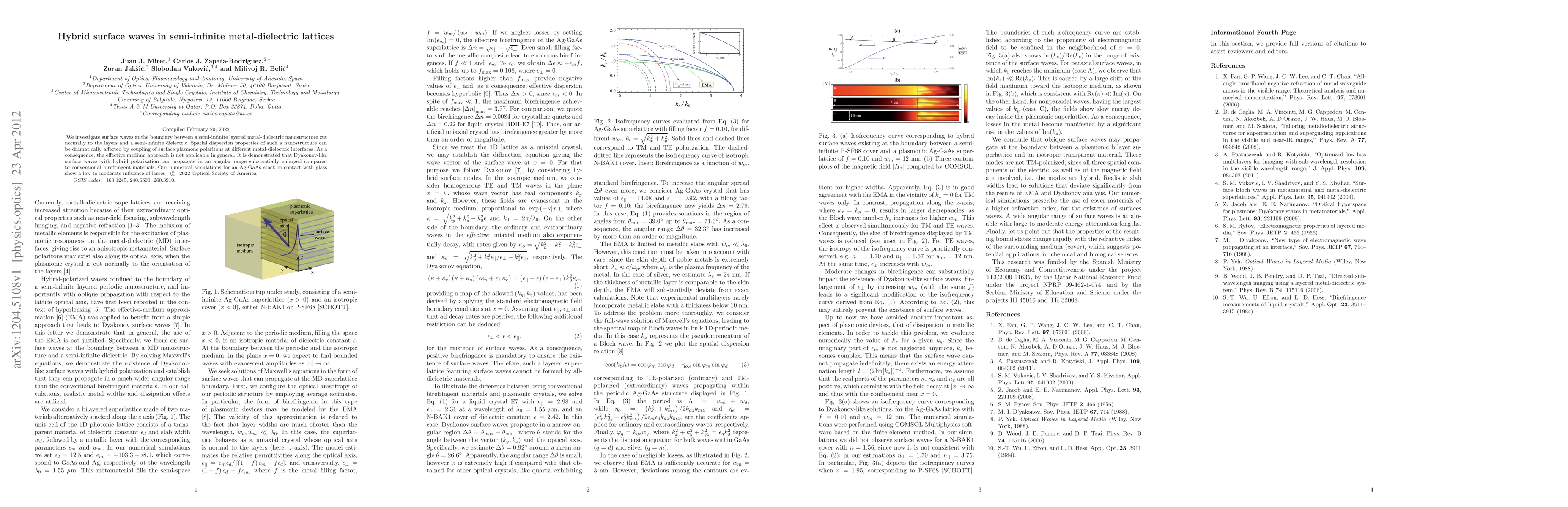 This research explores surface waves in metal-dielectric nanostructures, revealing hybrid Dyakonov-like waves with enhanced propagation range due to coupled surface plasmons. Simulations for an Ag-GaAs stack indicate minimal loss impact on these hybrid waves.