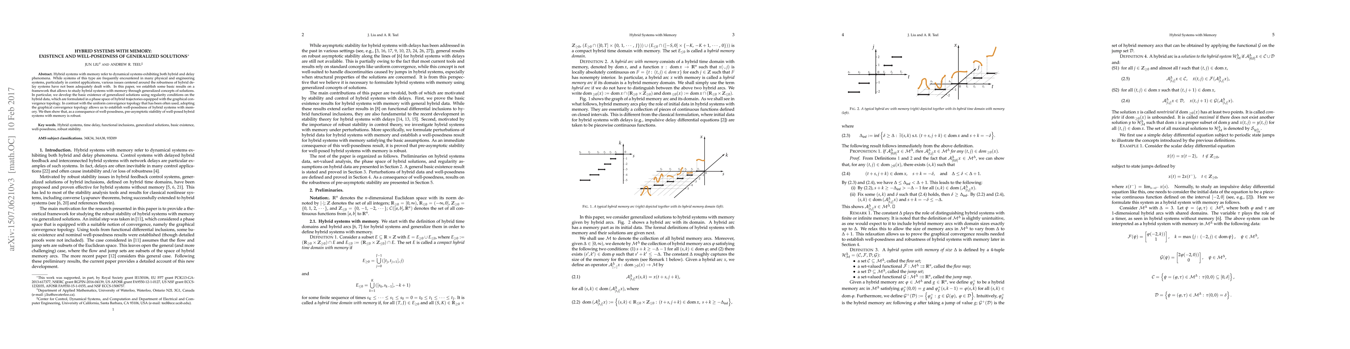 This paper establishes a framework for studying hybrid systems with memory, focusing on the existence and well-posedness of generalized solutions. The study employs a graphical convergence topology to ensure robustness and well-posedness, demonstrating pre-asymptotic stability in well-posed systems.