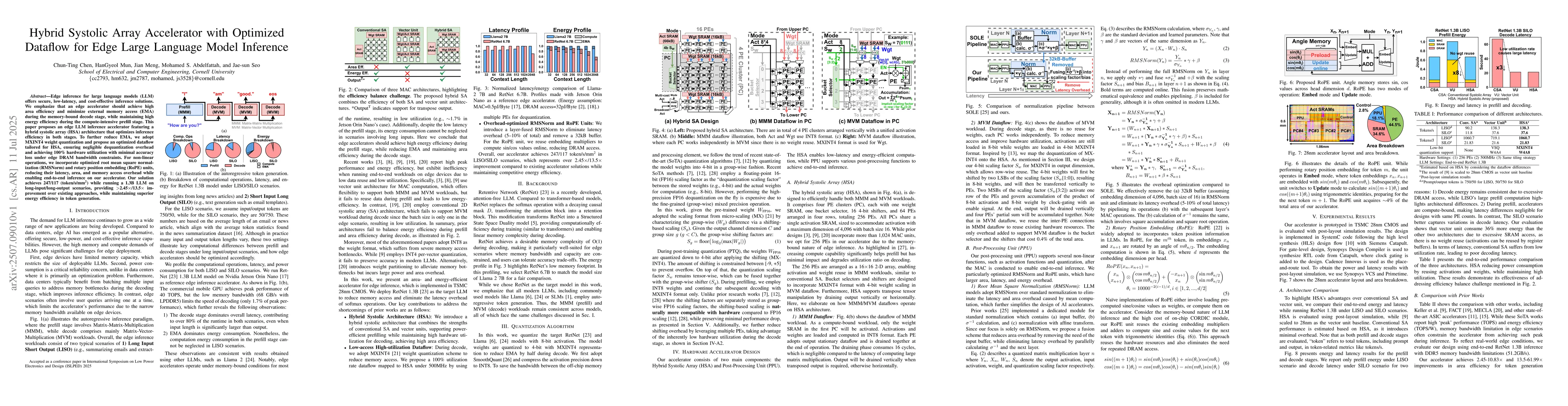Edge inference for large language models (LLM) offers secure, low-latency, and cost-effective inference solutions. We emphasize that an edge accelerator should achieve high area efficiency and minimize external memory access (EMA) during the memory-bound decode stage, while maintaining high energy efficiency during the compute intensive prefill stage. This paper proposes an edge LLM inference accelerator featuring a hybrid systolic array (HSA) architecture that optimizes inference efficiency in both stages. To further reduce EMA, we adopt MXINT4 weight quantization and propose an optimized dataflow tailored for HSA, ensuring negligible dequantization overhead and achieving 100% hardware utilization with minimal accuracy loss under edge DRAM bandwidth constraints. For non-linear operations, we incorporate optimized root mean square normalization (RMSNorm) and rotary position embedding (RoPE) units, reducing their latency, area, and memory access overhead while enabling end-to-end inference on our accelerator. Our solution achieves 247/117 (token/s/mm2) while running a 1.3B LLM on long-input/long-output scenarios, providing >2.45x/13.5x improvement over existing approaches, while maintaining superior energy efficiency in token generation.