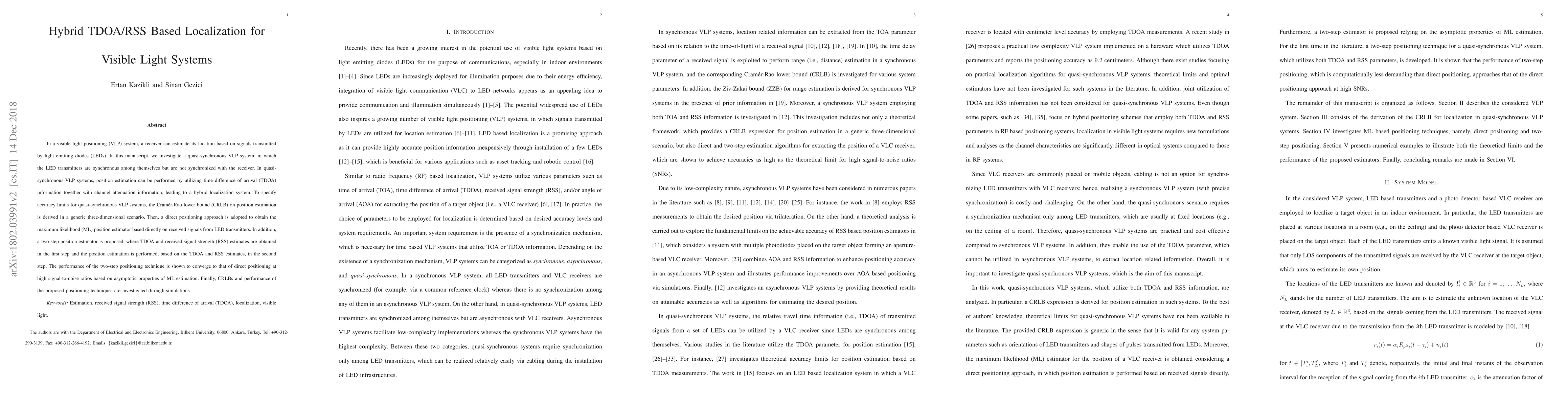 This paper proposes a hybrid localization system for quasi-synchronous visible light positioning (VLP) using time difference of arrival (TDOA) and received signal strength (RSS) information. It derives the Cramer-Rao lower bound for position estimation and introduces both direct and two-step positioning techniques, demonstrating their performance through simulations.