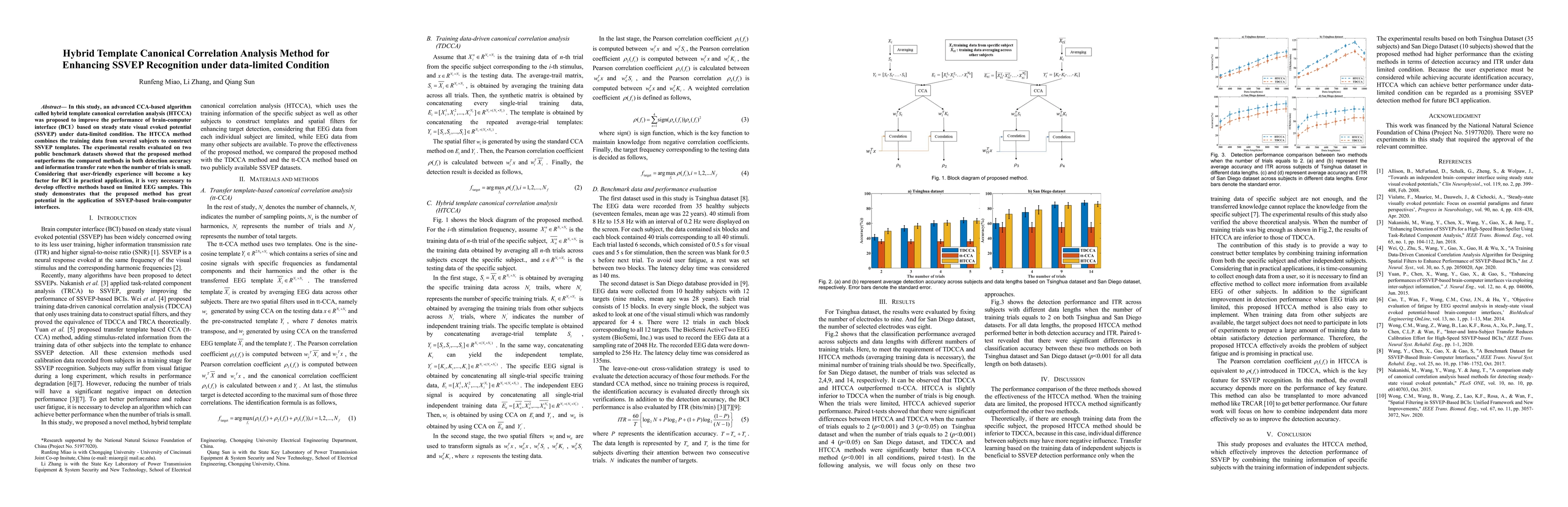 This paper proposes a hybrid template canonical correlation analysis method (HTCCA) to enhance SSVEP recognition in brain-computer interfaces under data-limited conditions. The HTCCA method combines training data from multiple subjects to construct SSVEP templates, showing improved detection accuracy and information transfer rate on benchmark datasets.