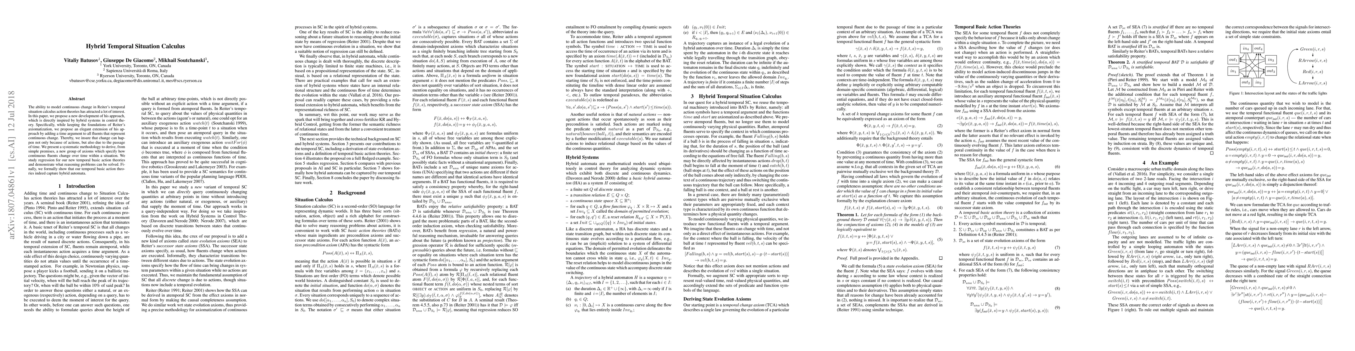 This paper introduces a hybrid temporal situation calculus, extending Reiter's temporal logic to model continuous change by incorporating time into fluents, enabling changes due to both actions and time passage. It develops a methodology to derive axioms for reasoning about continuous change and shows its equivalence to hybrid automata.