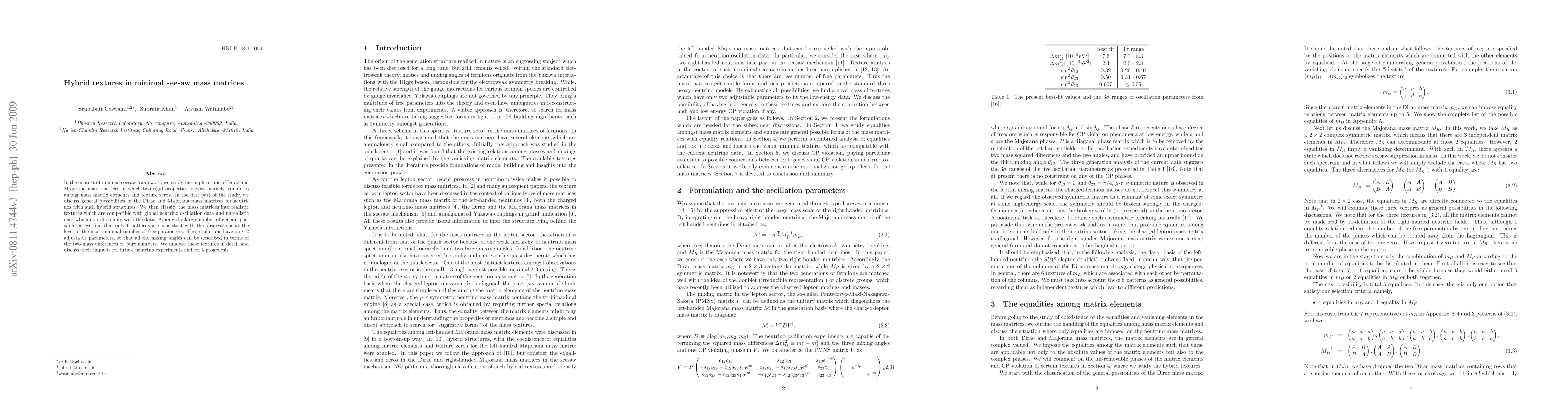 In the context of minimal seesaw framework, we study the implications of Dirac and Majorana mass matrices in which two rigid properties coexist, namely, equalities among mass matrix elements and texture zeros. In the first part of the study, we discuss general possibilities of the Dirac and Majorana mass matrices for neutrinos with such hybrid structures. We then classify the mass matrices into realistic textures which are compatible with global neutrino oscillation data and unrealistic ones which do not comply with the data. Among the large number of general possibilities, we find that only 6 patterns are consistent with the observations at the level of the most minimal number of free parameters. These solutions have only 2 adjustable parameters, so that all the mixing angles can be described in terms of the two mass differences or pure numbers. We analyze these textures in detail and discuss their impacts for future neutrino experiments and for leptogenesis.