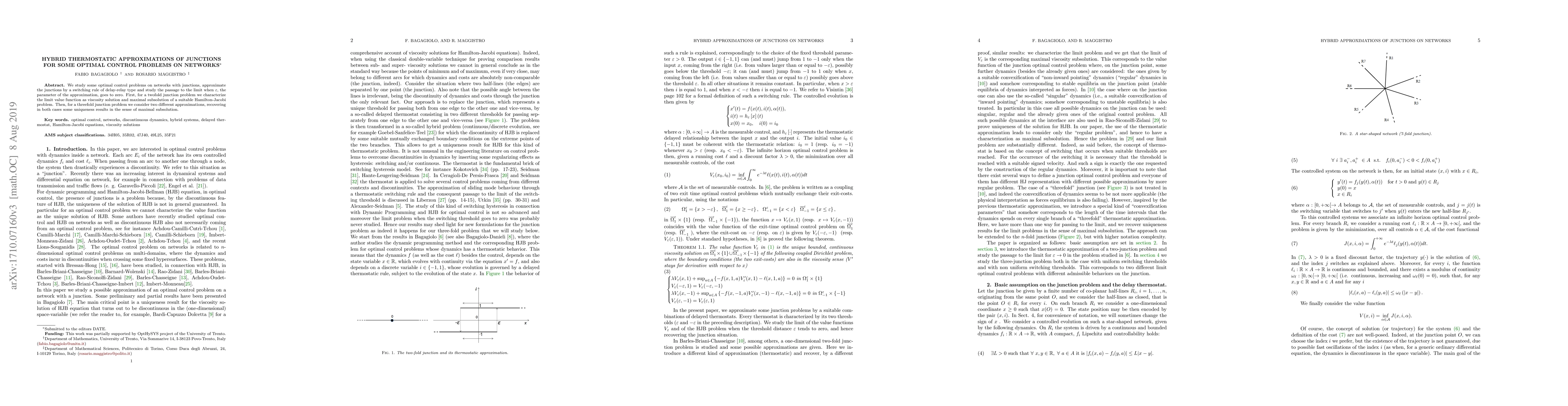 We study some optimal control problems on networks with junctions, approximate the junctions by a switching rule of delay-relay type and study the passage to the limit when $\varepsilon$, the parameter of the approximation, goes to zero. First, for a twofold junction problem we characterize the limit value function as viscosity solution and maximal subsolution of a suitable Hamilton-Jacobi problem. Then, for a threefold junction problem we consider two different approximations, recovering in both cases some uniqueness results in the sense of maximal subsolution.