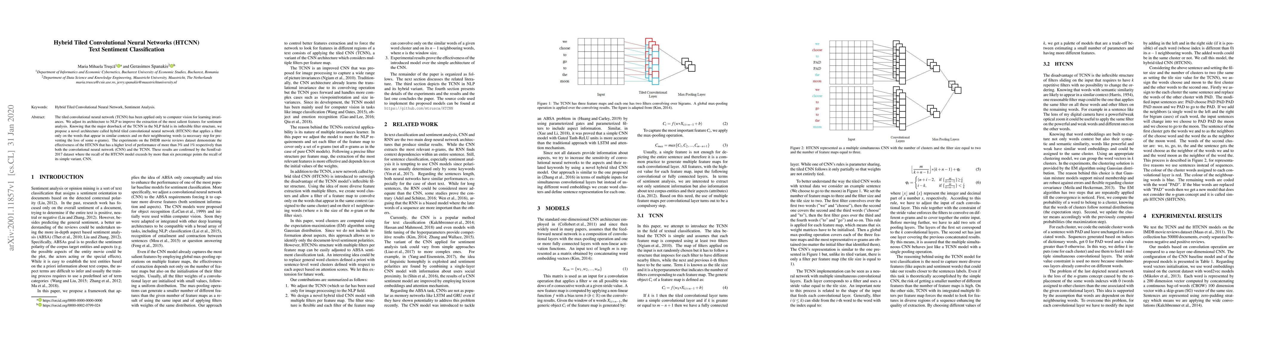 The tiled convolutional neural network (tiled CNN) has been applied only to computer vision for learning invariances. We adjust its architecture to NLP to improve the extraction of the most salient features for sentiment analysis. Knowing that the major drawback of the tiled CNN in the NLP field is its inflexible filter structure, we propose a novel architecture called hybrid tiled CNN that applies a filter only on the words that appear in the similar contexts and on their neighbor words (a necessary step for preventing the loss of some n-grams). The experiments on the datasets of IMDB movie reviews and SemEval 2017 demonstrate the efficiency of the hybrid tiled CNN that performs better than both CNN and tiled CNN.