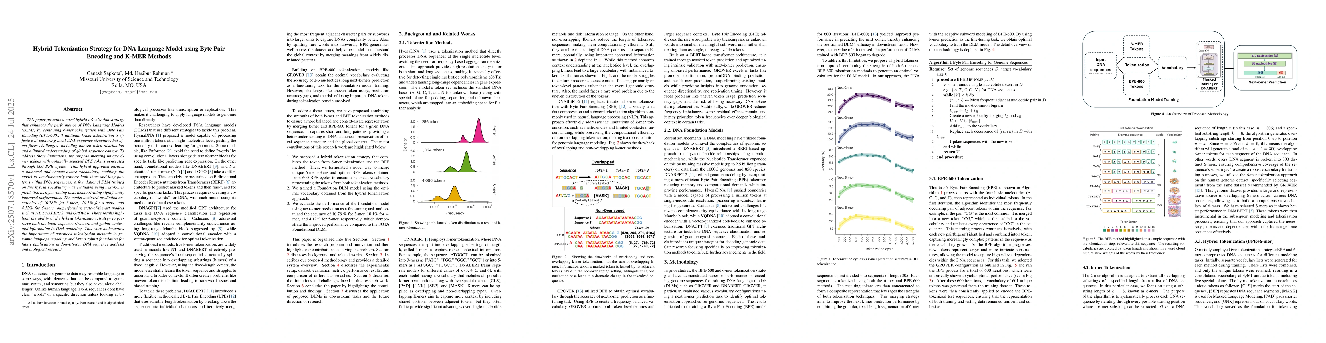 This paper presents a novel hybrid tokenization strategy that enhances the performance of DNA Language Models (DLMs) by combining 6-mer tokenization with Byte Pair Encoding (BPE-600). Traditional k-mer tokenization is effective at capturing local DNA sequence structures but often faces challenges, including uneven token distribution and a limited understanding of global sequence context. To address these limitations, we propose merging unique 6mer tokens with optimally selected BPE tokens generated through 600 BPE cycles. This hybrid approach ensures a balanced and context-aware vocabulary, enabling the model to capture both short and long patterns within DNA sequences simultaneously. A foundational DLM trained on this hybrid vocabulary was evaluated using next-k-mer prediction as a fine-tuning task, demonstrating significantly improved performance. The model achieved prediction accuracies of 10.78% for 3-mers, 10.1% for 4-mers, and 4.12% for 5-mers, outperforming state-of-the-art models such as NT, DNABERT2, and GROVER. These results highlight the ability of the hybrid tokenization strategy to preserve both the local sequence structure and global contextual information in DNA modeling. This work underscores the importance of advanced tokenization methods in genomic language modeling and lays a robust foundation for future applications in downstream DNA sequence analysis and biological research.