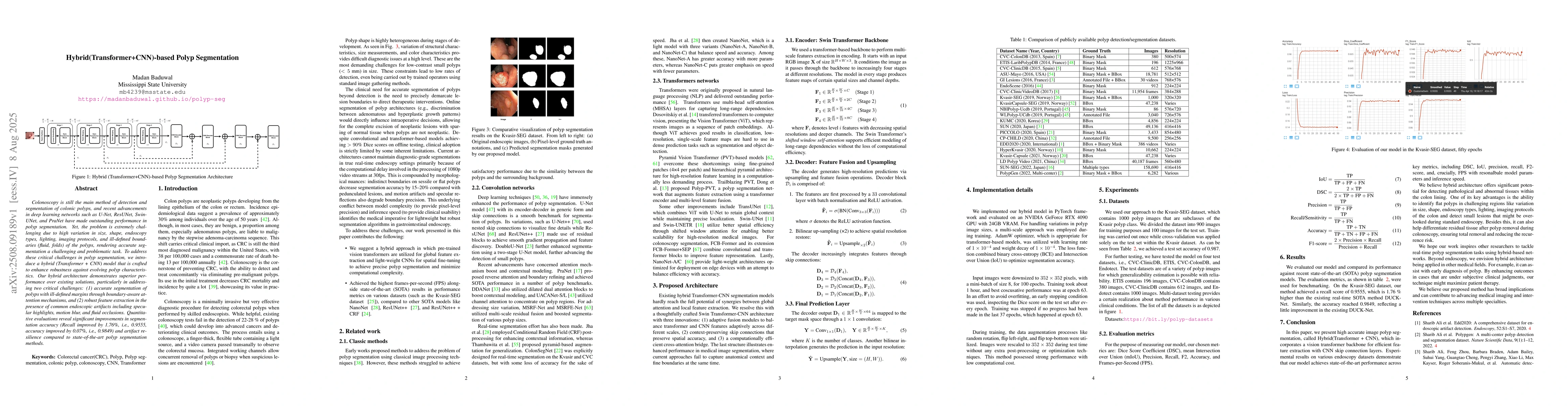 Colonoscopy is still the main method of detection and segmentation of colonic polyps, and recent advancements in deep learning networks such as U-Net, ResUNet, Swin-UNet, and PraNet have made outstanding performance in polyp segmentation. Yet, the problem is extremely challenging due to high variation in size, shape, endoscopy types, lighting, imaging protocols, and ill-defined boundaries (fluid, folds) of the polyps, rendering accurate segmentation a challenging and problematic task. To address these critical challenges in polyp segmentation, we introduce a hybrid (Transformer + CNN) model that is crafted to enhance robustness against evolving polyp characteristics. Our hybrid architecture demonstrates superior performance over existing solutions, particularly in addressing two critical challenges: (1) accurate segmentation of polyps with ill-defined margins through boundary-aware attention mechanisms, and (2) robust feature extraction in the presence of common endoscopic artifacts, including specular highlights, motion blur, and fluid occlusions. Quantitative evaluations reveal significant improvements in segmentation accuracy (Recall improved by 1.76%, i.e., 0.9555, accuracy improved by 0.07%, i.e., 0.9849) and artifact resilience compared to state-of-the-art polyp segmentation methods.