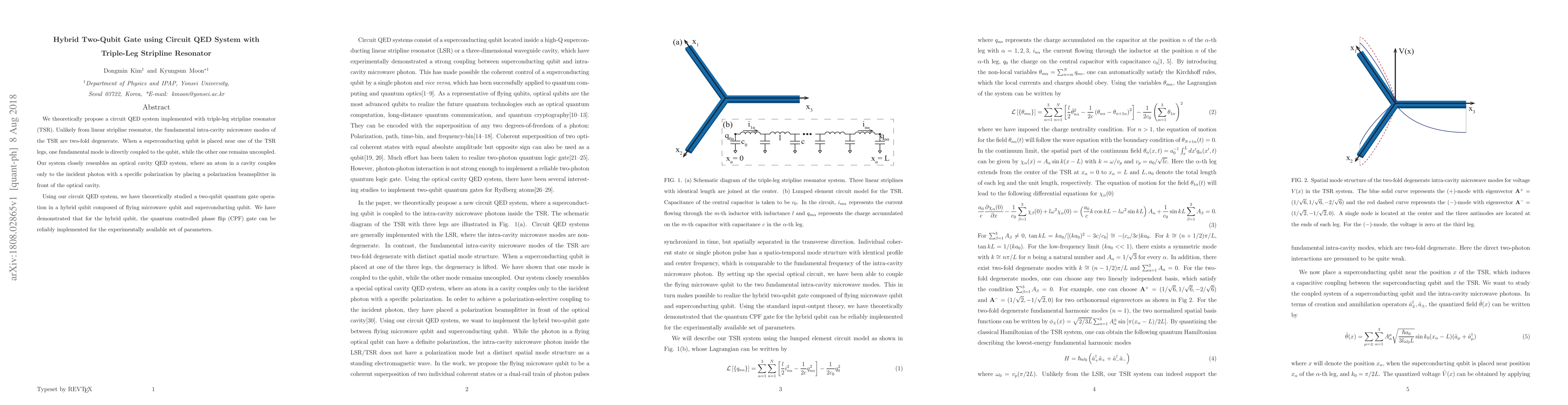 This paper proposes a circuit QED system using a triple-leg stripline resonator, where a superconducting qubit interacts selectively with one of two degenerate microwave modes. The system enables the implementation of a hybrid two-qubit quantum controlled phase flip gate using a combination of a flying microwave qubit and a superconducting qubit.