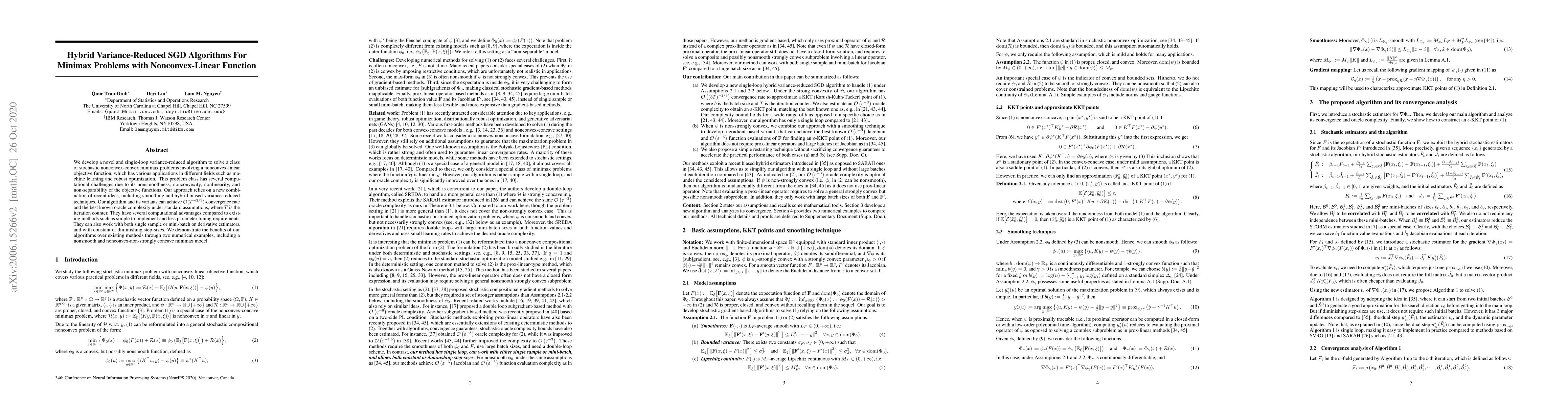 We develop a novel and single-loop variance-reduced algorithm to solve a class of stochastic nonconvex-convex minimax problems involving a nonconvex-linear objective function, which has various applications in different fields such as machine learning and robust optimization. This problem class has several computational challenges due to its nonsmoothness, nonconvexity, nonlinearity, and non-separability of the objective functions. Our approach relies on a new combination of recent ideas, including smoothing and hybrid biased variance-reduced techniques. Our algorithm and its variants can achieve $\mathcal{O}(T^{-2/3})$-convergence rate and the best known oracle complexity under standard assumptions, where $T$ is the iteration counter. They have several computational advantages compared to existing methods such as simple to implement and less parameter tuning requirements. They can also work with both single sample or mini-batch on derivative estimators, and with constant or diminishing step-sizes. We demonstrate the benefits of our algorithms over existing methods through two numerical examples, including a nonsmooth and nonconvex-non-strongly concave minimax model.
