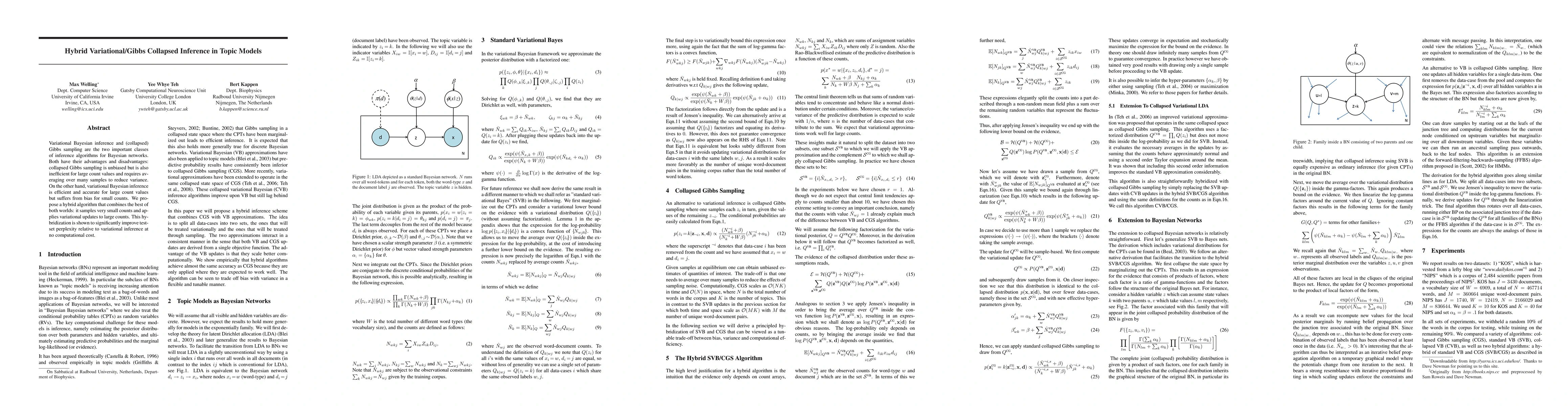 This paper proposes a hybrid variational/Gibbs collapsed inference algorithm for topic models that leverages the strengths of both variational Bayesian inference and collapsed Gibbs sampling. The hybrid method enhances performance by sampling small counts and using variational updates for large counts, resulting in better perplexity on test sets without increased computational cost.