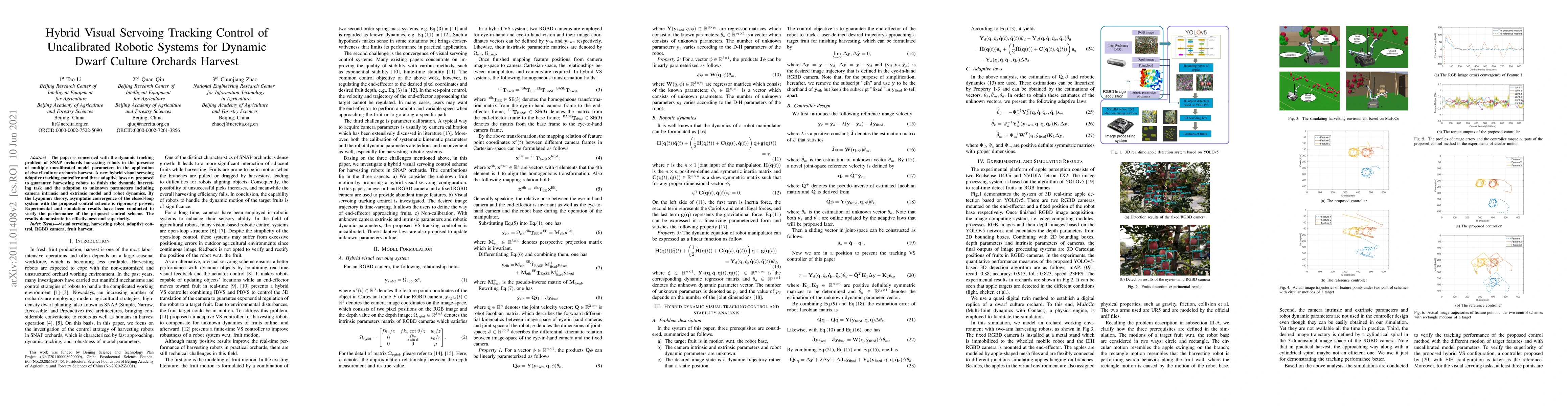 The paper is concerned with the dynamic tracking problem of SNAP orchards harvesting robots in the presence of multiple uncalibrated model parameters in the application of dwarf culture orchards harvest. A new hybrid visual servoing adaptive tracking controller and three adaptive laws are proposed to guarantee harvesting robots to finish the dynamic harvesting task and the adaption to unknown parameters including camera intrinsic and extrinsic model and robot dynamics. By the Lyapunov theory, asymptotic convergence of the closed-loop system with the proposed control scheme is rigorously proven. Experimental and simulation results have been conducted to verify the performance of the proposed control scheme. The results demonstrate its effectiveness and superiority.