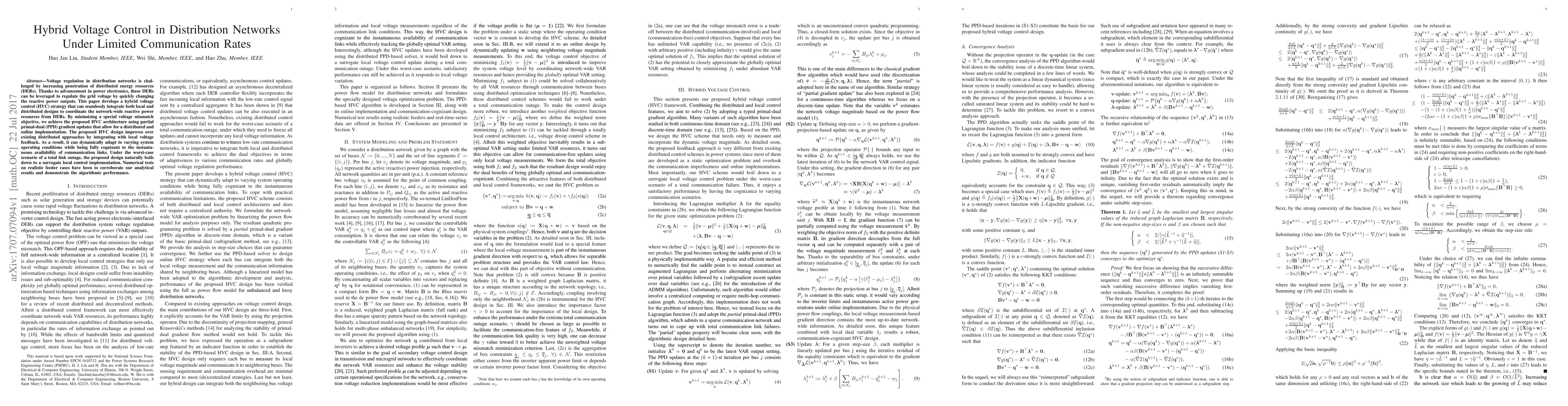 This paper proposes a hybrid voltage control (HVC) strategy for distribution networks with limited communication rates, integrating local and distributed designs to coordinate reactive power resources from distributed energy resources (DERs). The HVC architecture uses partial primal-dual gradient updates for distributed and online implementation, enhancing adaptability to varying system conditions while maintaining communication efficiency.