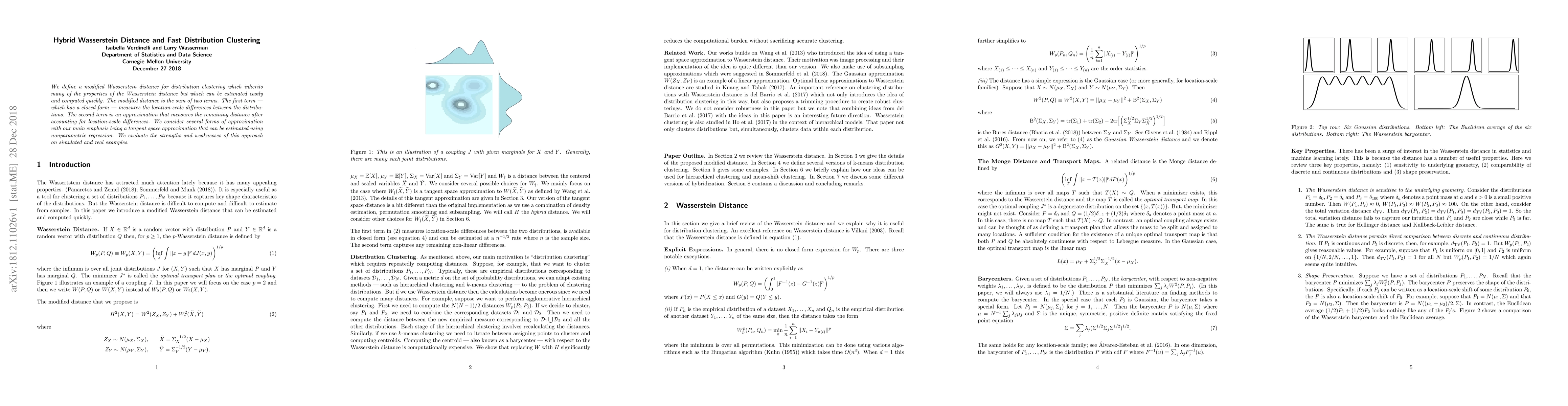 This paper introduces a hybrid Wasserstein distance for efficient distribution clustering, combining a closed-form location-scale term with a tangent space approximation for remaining differences, evaluated on both simulated and real datasets. The approach aims to simplify computation while maintaining accuracy.