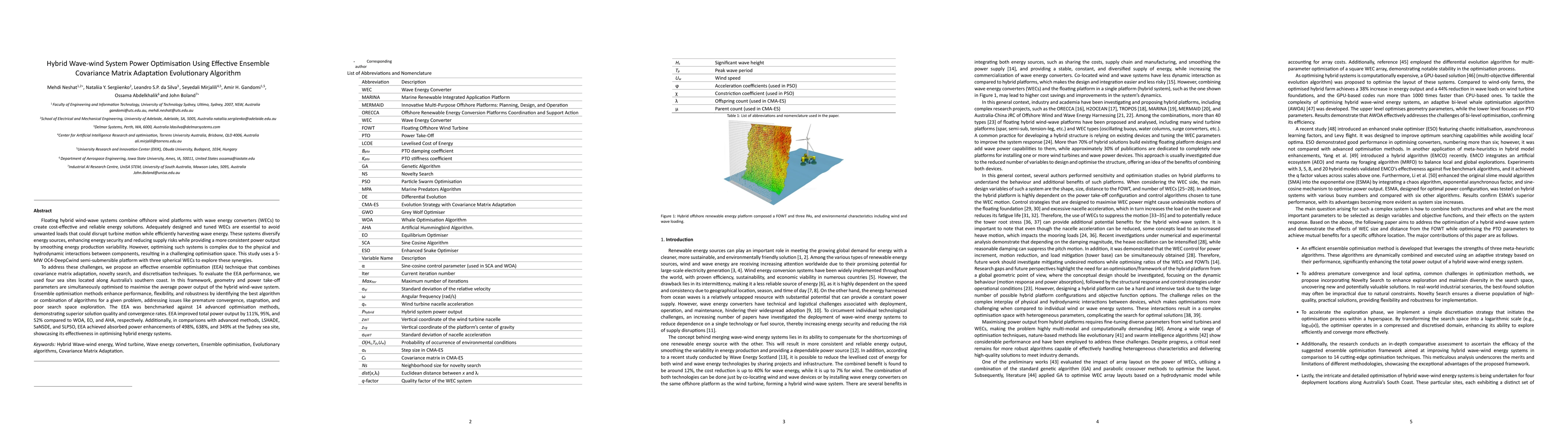 A new optimization method called Ensemble Covariance Matrix Adaptation Evolutionary Algorithm (EEA) improves energy production in hybrid wind-wave systems by up to 111% compared to existing methods.
