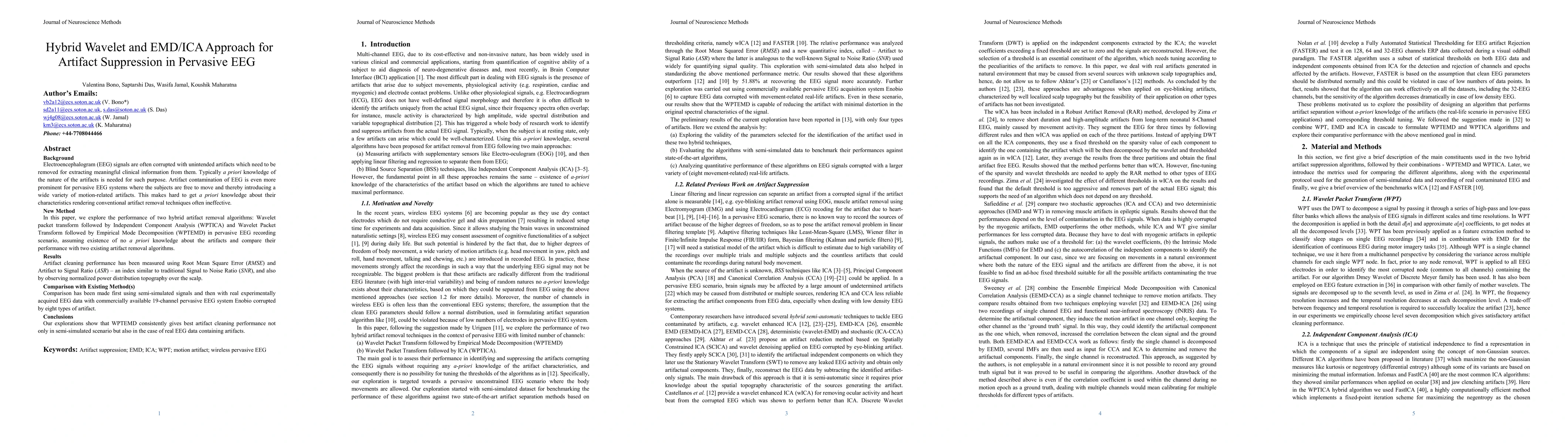 This paper investigates the effectiveness of hybrid wavelet and artifact removal techniques (WPTICA and WPTEMD) for suppressing artifacts in pervasive EEG recordings, where conventional methods fail due to lack of a priori knowledge. The WPTEMD approach consistently outperforms existing methods in both semi-simulated and real EEG data, as measured by RMSE, ASR, and power distribution topography.