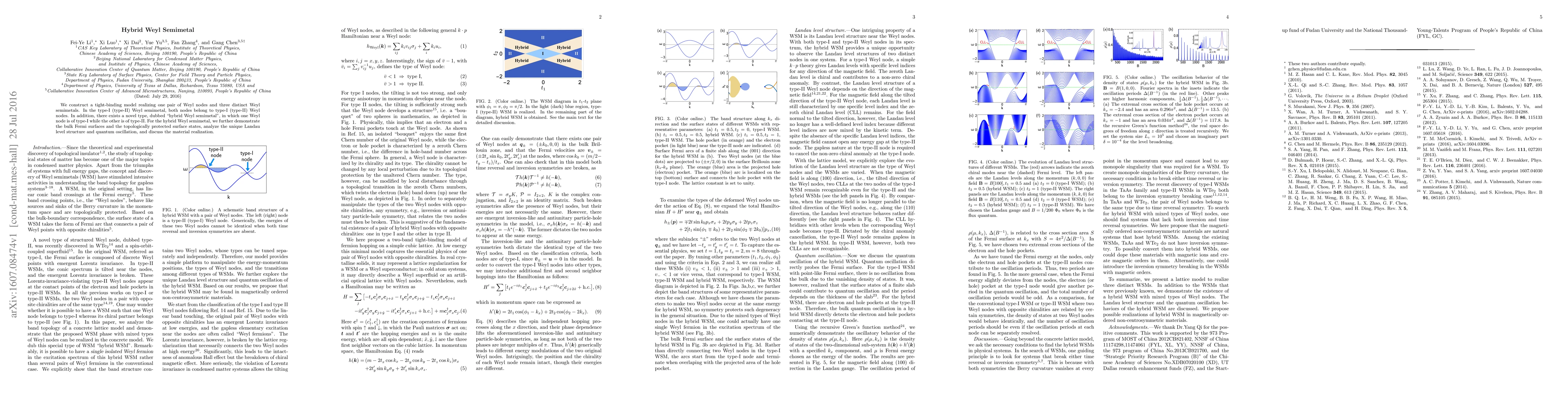 The research constructs a tight-binding model for three distinct Weyl semimetals, including a novel "hybrid Weyl semimetal" featuring one type-I and one type-II Weyl node, and explores its unique Fermi surfaces, surface states, Landau levels, and quantum oscillations, alongside potential material implementations.
