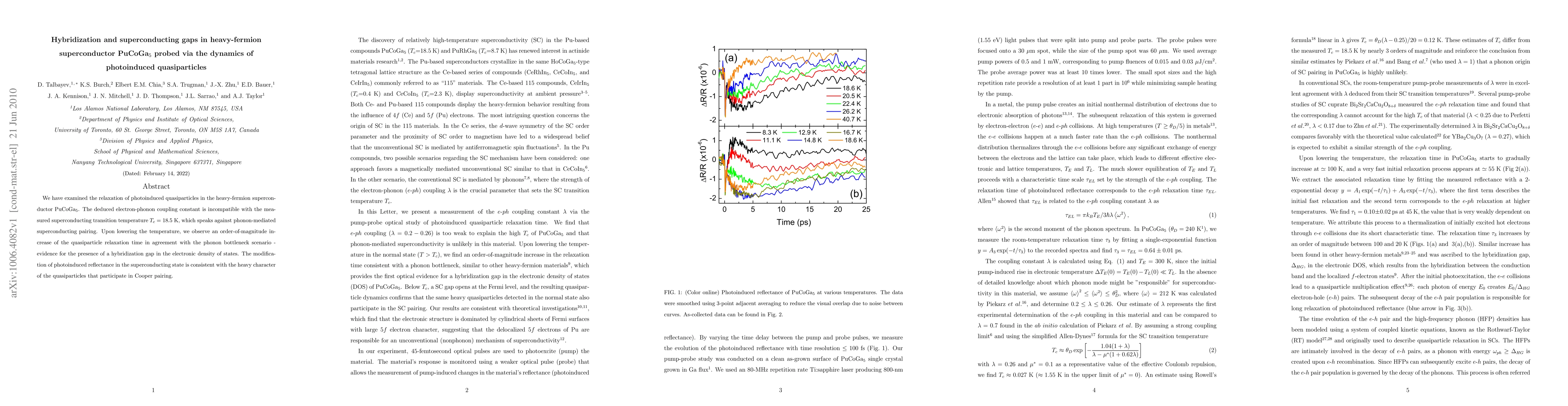 The study investigates PuCoGa5, a heavy-fermion superconductor, using photoinduced quasiparticle relaxation dynamics. It finds that electron-phonon coupling is weak, challenging phonon-mediated superconductivity. A significant increase in quasiparticle relaxation time at low temperatures supports the presence of a hybridization gap. The superconducting state's reflectance modification indicates heavy quasiparticles involved in Cooper pairing.