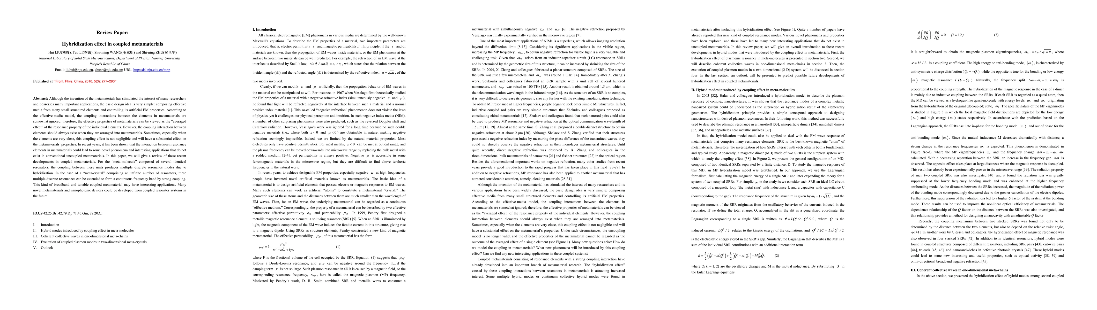 This paper reviews the hybridization effects in coupled metamaterials, highlighting how interactions between closely arranged resonators lead to novel resonance modes and continuous frequency bands. These phenomena enable the development of broadband, tunable metamaterials with potential applications in advanced nanophotonic devices.