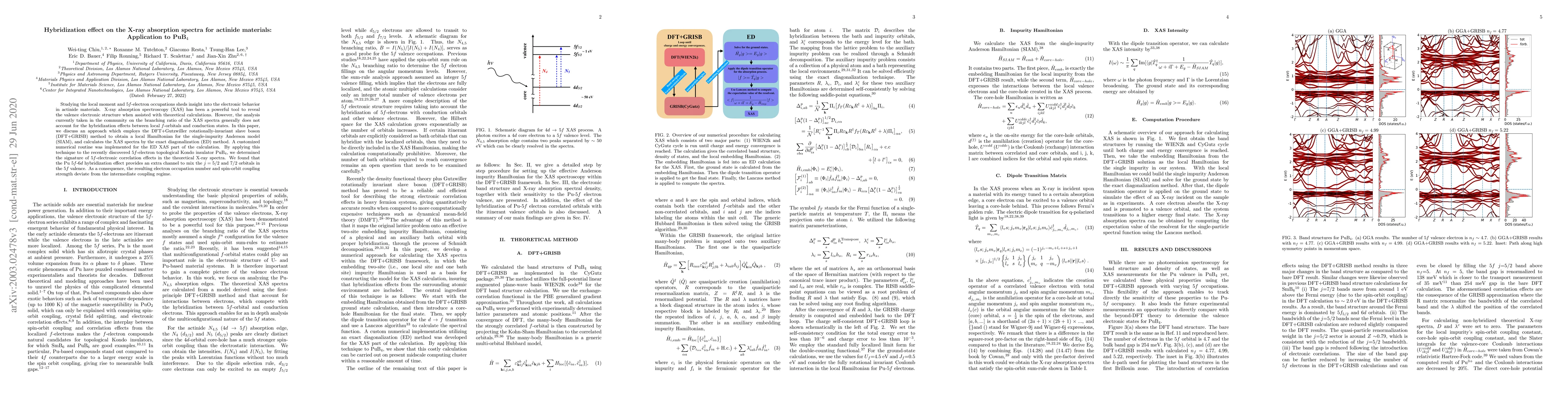 Studying the local moment and 5$f$-electron occupations sheds insight into the electronic behavior in actinide materials. X-ray absorption spectroscopy (XAS) has been a powerful tool to reveal the valence electronic structure when assisted with theoretical calculations. However, the analysis currently taken in the community on the branching ratio of the XAS spectra generally does not account for the hybridization effects between local $f$-orbitals and conduction states. In this paper, we discuss an approach which employs the DFT+Gutzwiller rotationally-invariant slave boson (DFT+GRISB) method to obtain a local Hamiltonian for the single-impurity Anderson model (SIAM), and calculates the XAS spectra by the exact diagonalization (ED) method. A customized numerical routine was implemented for the ED XAS part of the calculation. By applying this technique to the recently discovered 5$f$-electron topological Kondo insulator PuB$_4$, we determined the signature of 5$f$-electronic correlation effects in the theoretical X-ray spectra. We found that the Pu 5$f$-6$d$ hybridization effect provides an extra channel to mix the $j=5/2$ and $7/2$ orbitals in the 5$f$ valence. As a consequence, the resulting electron occupation number and spin-orbit coupling strength deviate from the intermediate coupling regime.