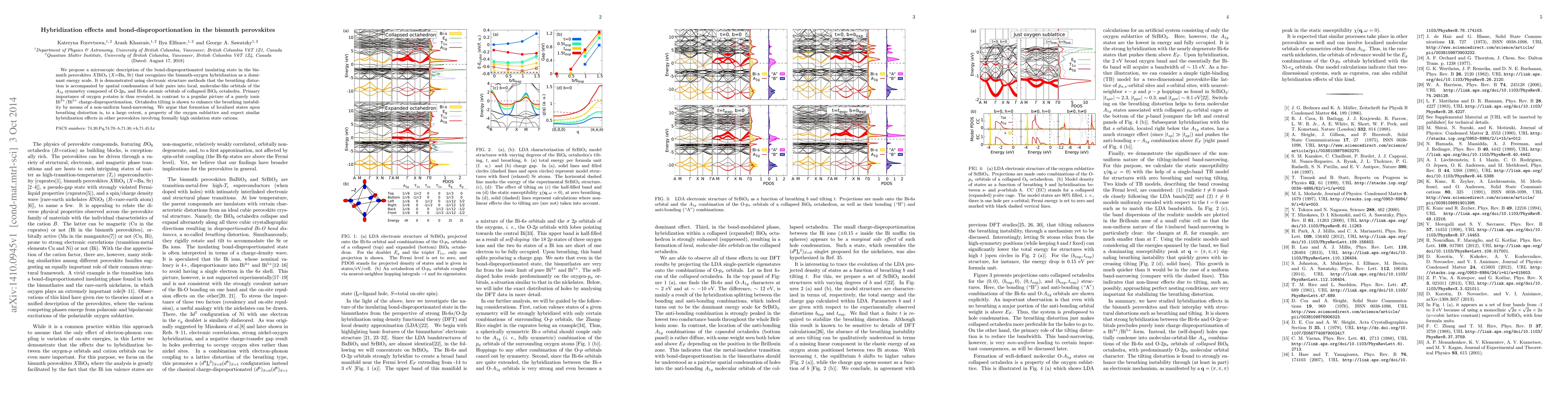 We propose a microscopic description of the bond-disproportionated insulating state in the bismuth perovskites $X$BiO$_3$ ($X$=Ba, Sr) that recognizes the bismuth-oxygen hybridization as a dominant energy scale. It is demonstrated using electronic structure methods that the breathing distortion is accompanied by spatial condensation of hole pairs into local, molecular-like orbitals of the $A_{1g}$ symmetry composed of O-$2p_{\sigma}$ and Bi-$6s$ atomic orbitals of collapsed BiO$_6$ octahedra. Primary importance of oxygen $p$-states is thus revealed, in contrast to a popular picture of a purely ionic Bi$^{3+}$/Bi$^{5+}$ charge-disproportionation. Octahedra tilting is shown to enhance the breathing instability by means of a non-uniform band-narrowing. We argue that formation of localized states upon breathing distortion is, to a large extent, a property of the oxygen sublattice and expect similar hybridization effects in other perovskites involving formally high oxidation state cations.