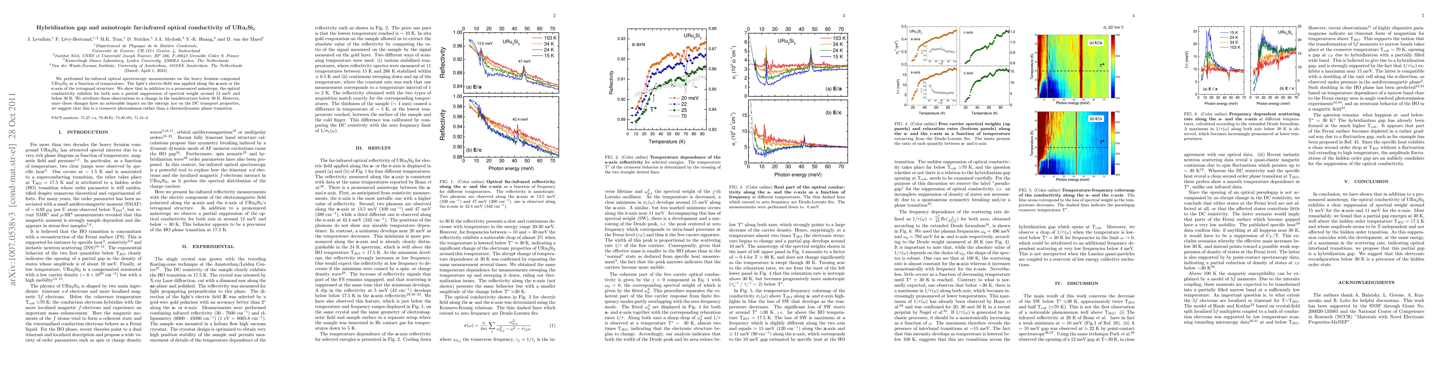 We performed far-infrared optical spectroscopy measurements on the heavy fermion compound URu 2 Si 2 as a function of temperature. The light's electric-field was applied along the a-axis or the c-axis of the tetragonal structure. We show that in addition to a pronounced anisotropy, the optical conductivity exhibits for both axis a partial suppression of spectral weight around 12 meV and below 30 K. We attribute these observations to a change in the bandstructure below 30 K. However, since these changes have no noticeable impact on the entropy nor on the DC transport properties, we suggest that this is a crossover phenomenon rather than a thermodynamic phase transition.