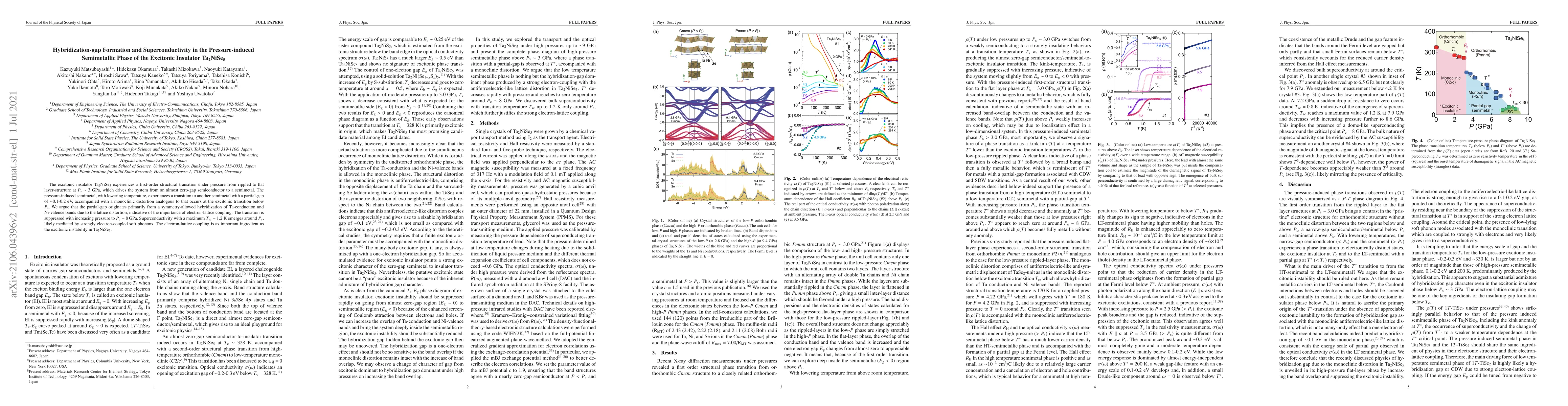 The excitonic insulator Ta$_2$NiSe$_5$ experiences a first-order structural transition under pressure from rippled to flat layer-structure at Ps = 3 GPa, which drives the system from an almost zero-gap semiconductor to a semimetal. The pressure-induced semimetal, with lowering temperature, experiences a transition to another semimetal with a partial-gap of 0.1-0.2 eV, accompanied with a monoclinic distortion analogous to that occurs at the excitonic transition below Ps. We argue that the partial-gap originates primarily from a symmetry-allowed hybridization of Ta-conduction and Ni-valence bands due to the lattice distortion, indicative of the importance of electron-lattice coupling. The transition is suppressed with increasing pressure to Pc = 8 GPa. Superconductivity with a maximum Tsc = 1.2 K emerges around Pc, likely mediated by strongly electron-coupled soft phonons. The electron-lattice coupling is as important ingredient as the excitonic instability in Ta2NiSe5.