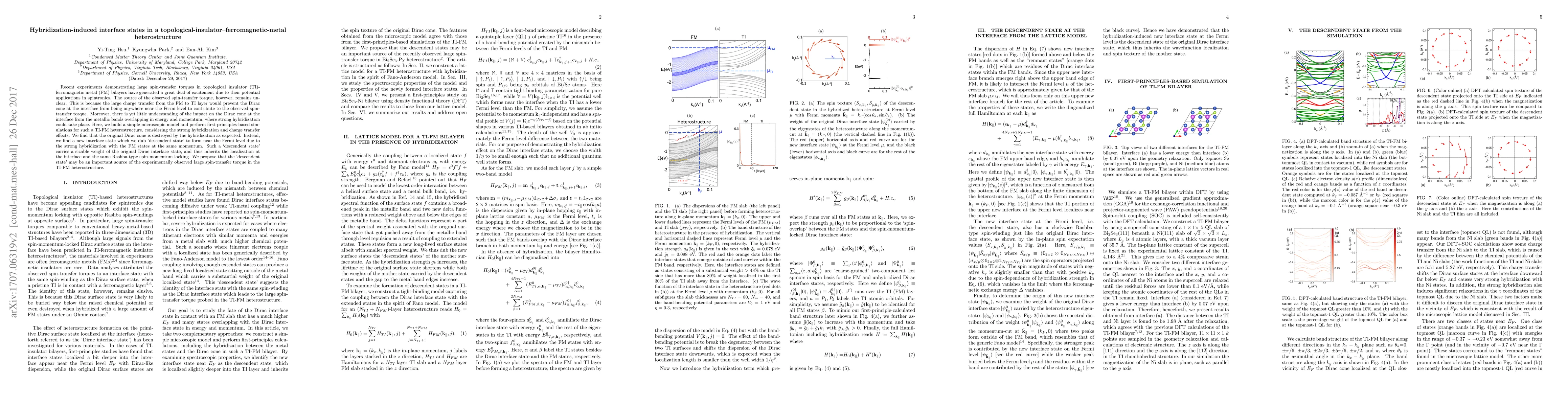 This paper investigates the hybridization-induced interface states in topological insulator-ferromagnetic metal heterostructures, proposing that a new 'descendent state' forms near the Fermi level due to strong hybridization. The 'descendent state' inherits the original Dirac cone's properties and may be responsible for the observed large spin-transfer torque in these heterostructures.