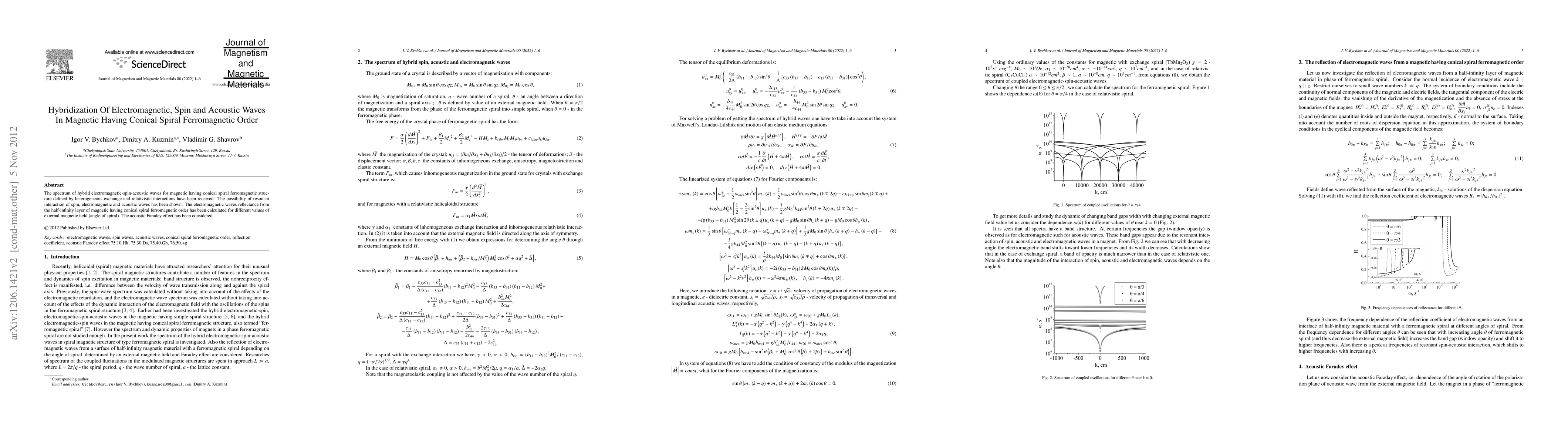 Researchers studied hybrid waves in a magnetic material with conical spiral ferromagnetic order, showing resonant interaction between spin, electromagnetic, and acoustic waves. They calculated wave reflection from the material for varying external magnetic fields.