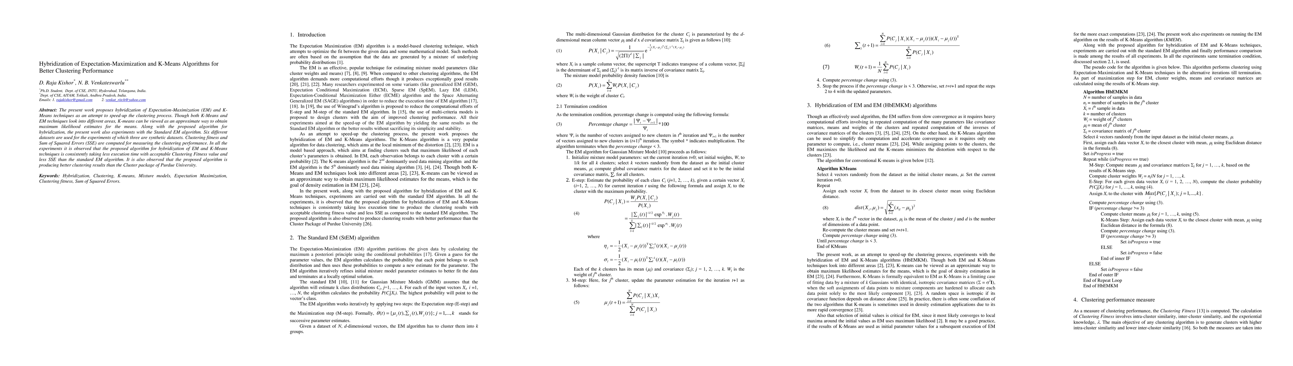 This paper proposes a hybrid algorithm combining Expectation-Maximization (EM) and K-Means to enhance clustering performance and speed. Experiments on six datasets show that the hybrid algorithm reduces execution time and achieves better clustering fitness and lower Sum of Squared Errors compared to the standard EM algorithm and the Cluster package of Purdue University.