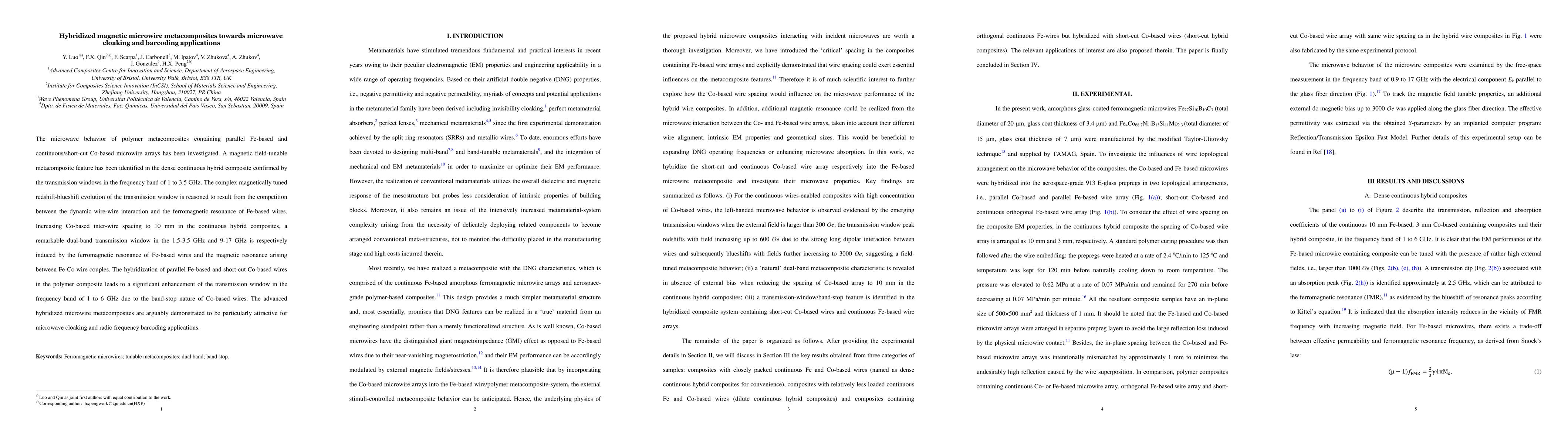 The microwave behavior of polymer metacomposites containing parallel Fe-based and continuous/short-cut Co-based microwire arrays has been investigated. A magnetic field-tunable metacomposite feature has been identified in the dense continuous hybrid composite confirmed by the transmission windows in the frequency band of 1 to 3.5 GHz. The complex magnetically tuned redshift-blueshift evolution of the transmission window is reasoned to result from the competition between the dynamic wire-wire interaction and the ferromagnetic resonance of Fe-based wires. Increasing Co-based inter-wire spacing to 10 mm in the continuous hybrid composites, a remarkable dual-band transmission window in the 1.5-3.5 GHz and 9-17 GHz is respectively induced by the ferromagnetic resonance of Fe-based wires and the magnetic resonance arising between Fe-Co wire couples. The hybridization of parallel Fe-based and short-cut Co-based wires in the polymer composite leads to a significant enhancement of the transmission window in the frequency band of 1 to 6 GHz due to the band-stop nature of Co-based wires. The advanced hybridized microwire metacomposites are arguably demonstrated to be particularly attractive for microwave cloaking and radio frequency barcoding applications.