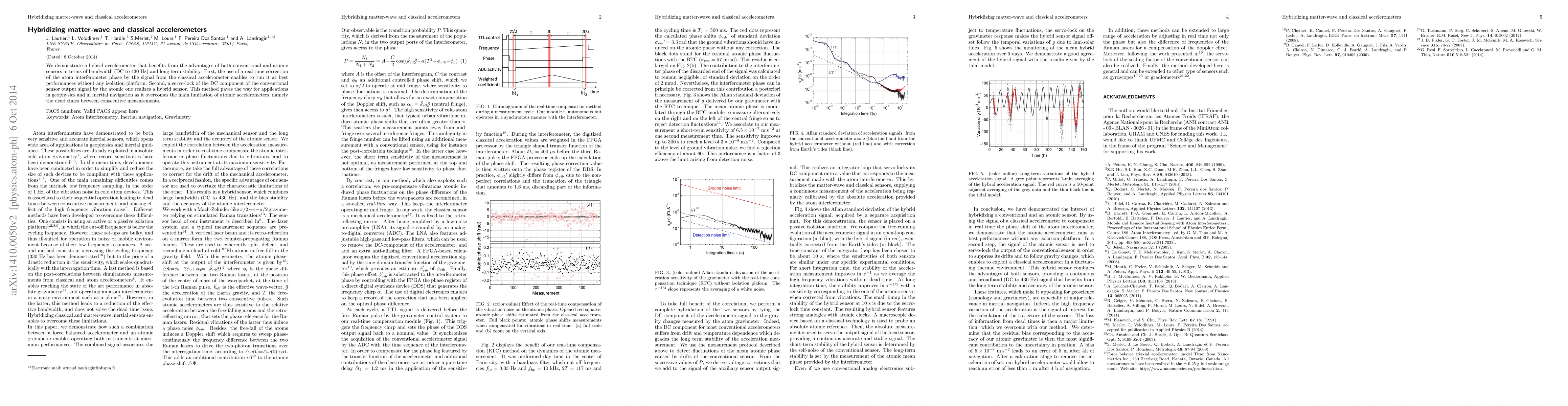 This paper presents a hybrid accelerometer combining the high stability of atomic sensors with the bandwidth of classical accelerometers, achieving DC to 430 Hz performance. The integration uses real-time phase correction and a servo-lock mechanism to enhance measurement accuracy and overcome atomic sensors' dead times, promising applications in geophysics and inertial navigation.