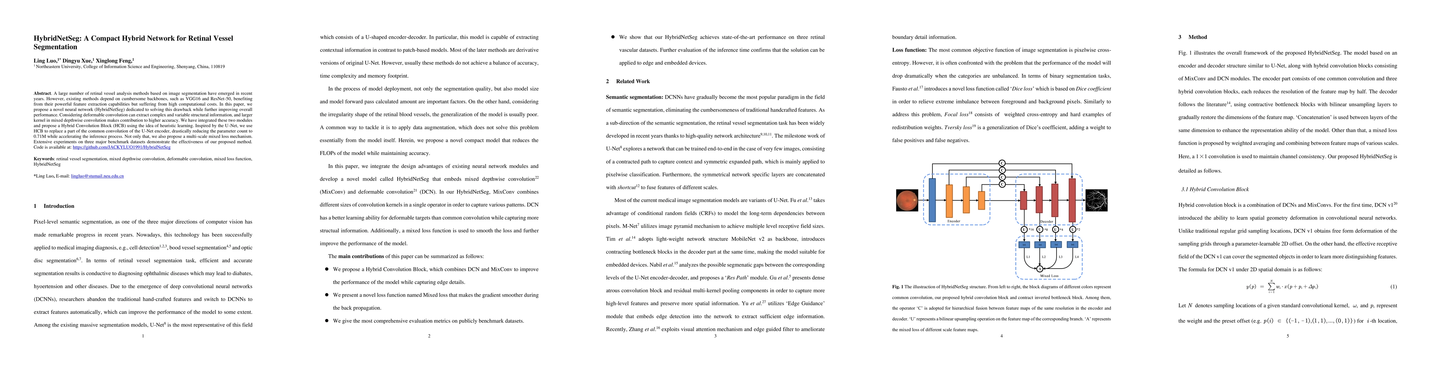 A large number of retinal vessel analysis methods based on image segmentation have emerged in recent years. However, existing methods depend on cumbersome backbones, such as VGG16 and ResNet-50, benefiting from their powerful feature extraction capabilities but suffering from high computational costs. In this paper, we propose a novel neural network (HybridNetSeg) dedicated to solving this drawback while further improving overall performance. Considering deformable convolution can extract complex and variable structural information, and larger kernel in mixed depthwise convolution makes contribution to higher accuracy. We have integrated these two modules and propose a Hybrid Convolution Block (HCB) using the idea of heuristic learning. Inspired by the U-Net, we use HCB to replace a part of the common convolution of the U-Net encoder, drastically reducing the parameter count to 0.71M while accelerating the inference process. Not only that, we also propose a multi-scale mixed loss mechanism. Extensive experiments on three major benchmark datasets demonstrate the effectiveness of our proposed method