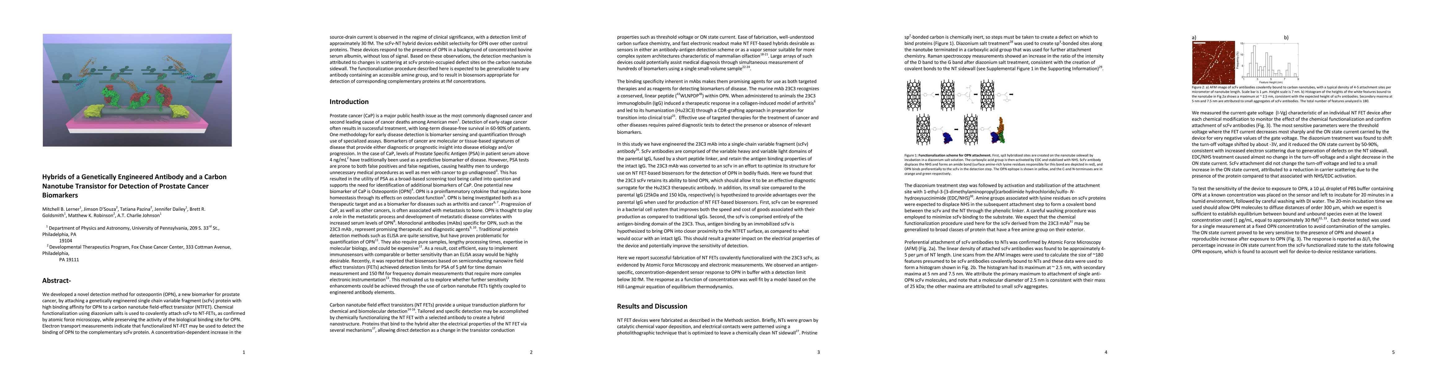 We developed a novel detection method for osteopontin (OPN), a new biomarker for prostate cancer, by attaching a genetically engineered single chain variable fragment (scFv) protein with high binding affinity for OPN to a carbon nanotube field-effect transistor (NTFET). Chemical functionalization using diazonium salts is used to covalently attach scFv to NT-FETs, as confirmed by atomic force microscopy, while preserving the activity of the biological binding site for OPN. Electron transport measurements indicate that functionalized NT-FET may be used to detect the binding of OPN to the complementary scFv protein. A concentration-dependent increase in the source-drain current is observed in the regime of clinical significance, with a detection limit of approximately 30 fM. The scFv-NT hybrid devices exhibit selectivity for OPN over other control proteins. These devices respond to the presence of OPN in a background of concentrated bovine serum albumin, without loss of signal. Based on these observations, the detection mechanism is attributed to changes in scattering at scFv protein-occupied defect sites on the carbon nanotube sidewall. The functionalization procedure described here is expected to be generalizable to any antibody containing an accessible amine group, and to result in biosensors appropriate for detection of corresponding complementary proteins at fM concentrations.