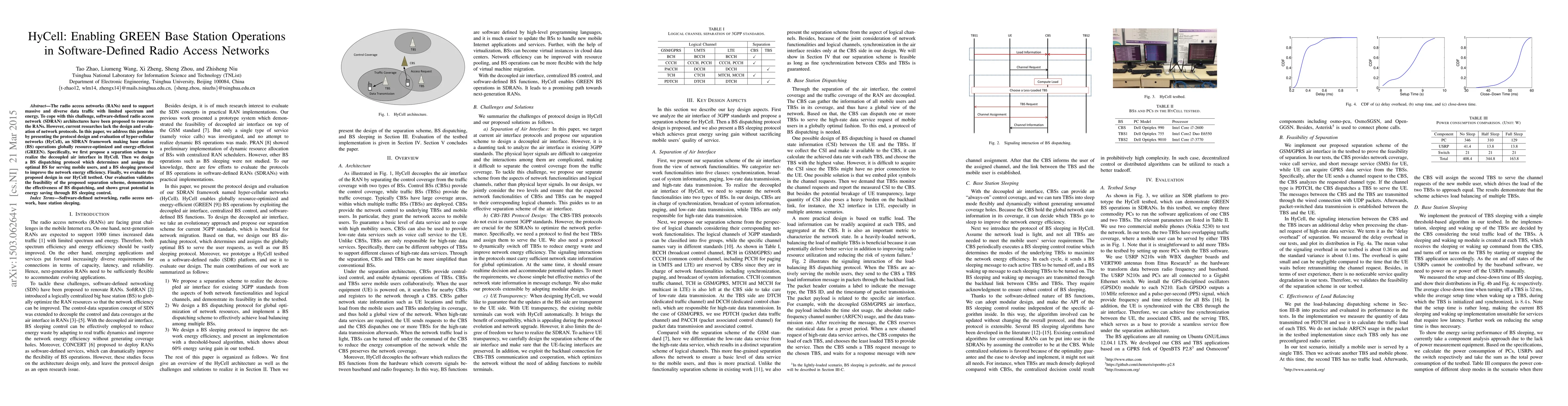 This paper introduces HyCell, a software-defined radio access network framework designed to optimize base station operations for energy efficiency. It proposes a separation scheme for the decoupled air interface, a BS dispatching protocol for optimal user serving, and a BS sleeping protocol to enhance energy efficiency, validated through a HyCell testbed.