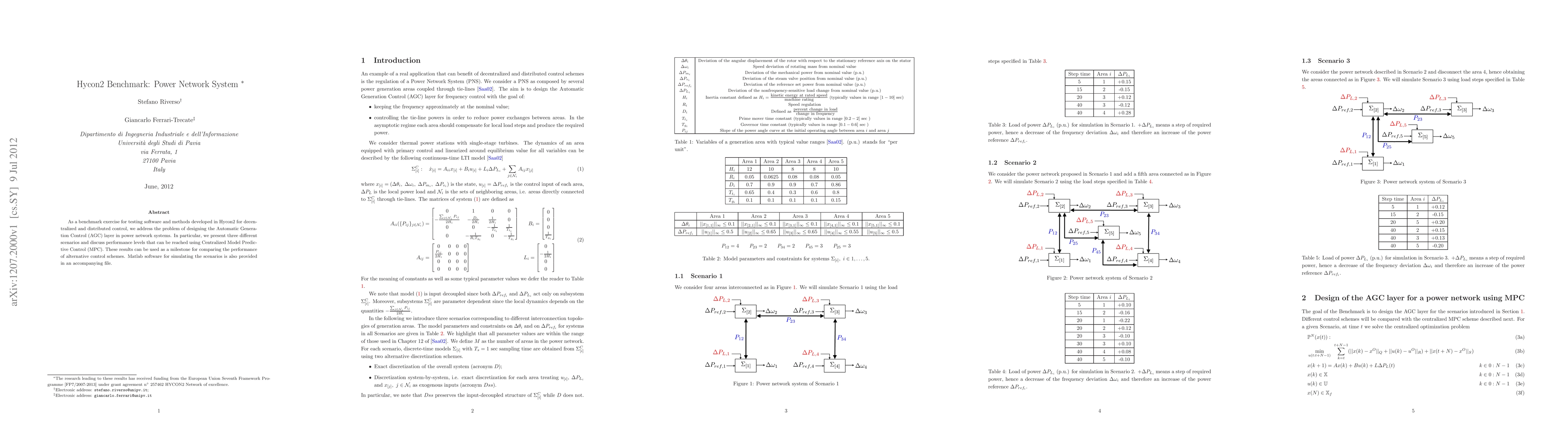 As a benchmark exercise for testing software and methods developed in Hycon2 for decentralized and distributed control, we address the problem of designing the Automatic Generation Control (AGC) layer in power network systems. In particular, we present three different scenarios and discuss performance levels that can be reached using Centralized Model Predictive Control (MPC). These results can be used as a milestone for comparing the performance of alternative control schemes. Matlab software for simulating the scenarios is also provided in an accompanying file.