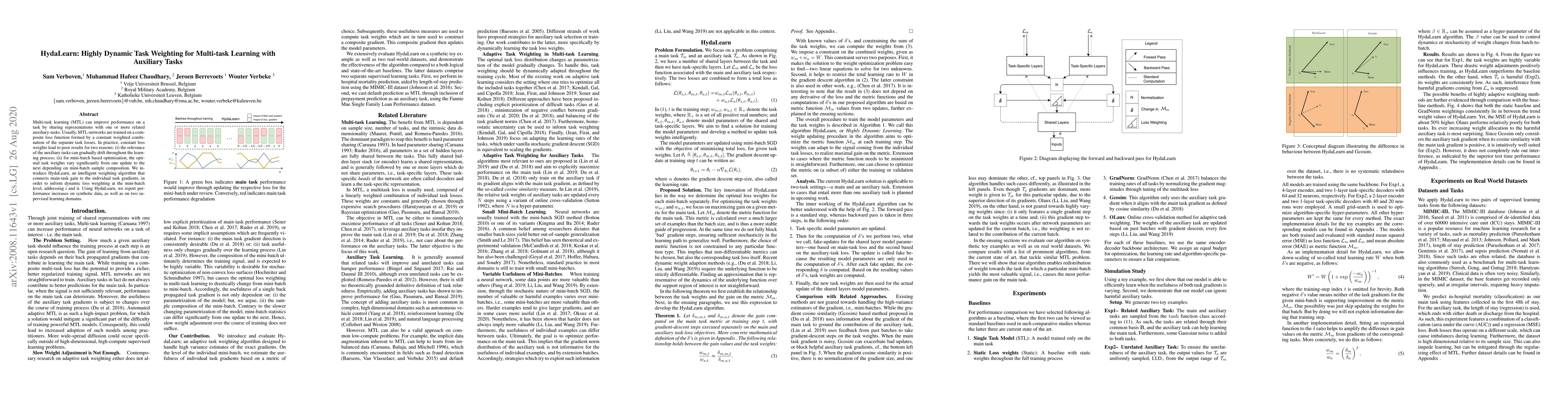 Multi-task learning (MTL) can improve performance on a task by sharing representations with one or more related auxiliary-tasks. Usually, MTL-networks are trained on a composite loss function formed by a constant weighted combination of the separate task losses. In practice, constant loss weights lead to poor results for two reasons: (i) the relevance of the auxiliary tasks can gradually drift throughout the learning process; (ii) for mini-batch based optimisation, the optimal task weights vary significantly from one update to the next depending on mini-batch sample composition. We introduce HydaLearn, an intelligent weighting algorithm that connects main-task gain to the individual task gradients, in order to inform dynamic loss weighting at the mini-batch level, addressing i and ii. Using HydaLearn, we report performance increases on synthetic data, as well as on two supervised learning domains.