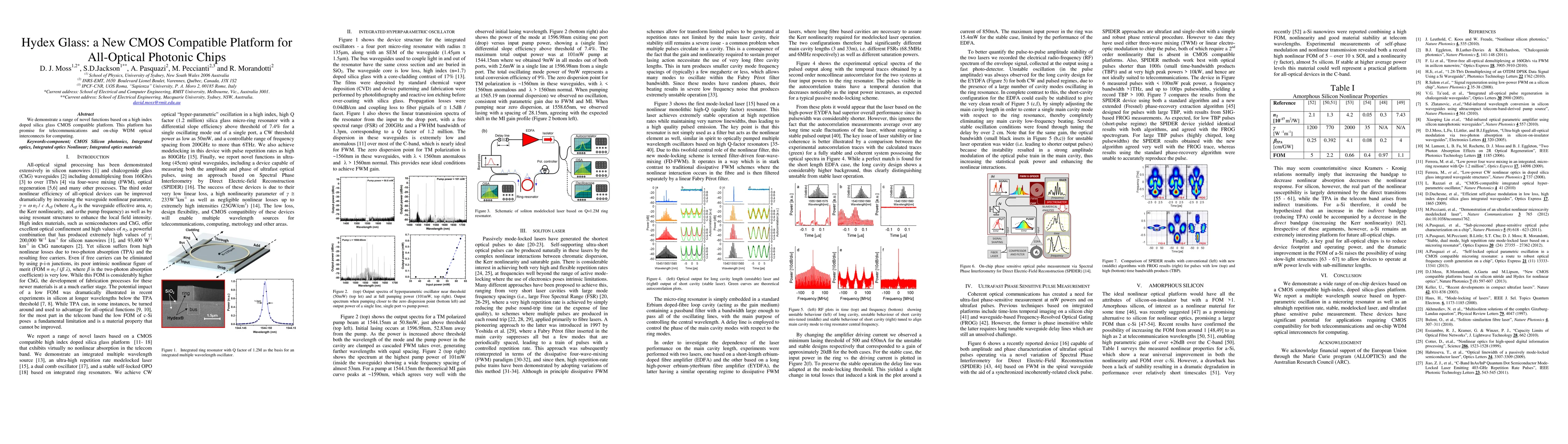 Summary: This paper introduces Hydex Glass, a CMOS-compatible high index doped silica platform enabling various novel optical functions, with potential applications in telecommunications and on-chip wavelength division multiplexing (WDM) optical interconnects.
