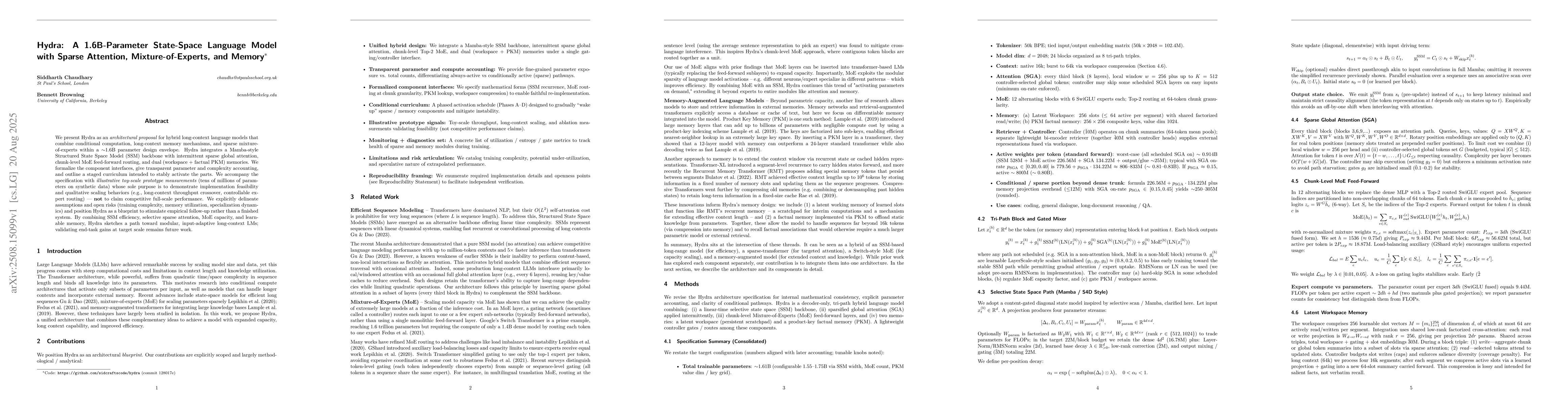 We present Hydra as an architectural proposal for hybrid long-context language models that combine conditional computation, long-context memory mechanisms, and sparse mixture-of-experts within an approximately 1.6B parameter design envelope. Hydra integrates a Mamba-style Structured State Space Model (SSM) backbone with intermittent sparse global attention, chunk-level MoE feed-forward routing, and dual (workspace plus factual PKM) memories. We formalize the component interfaces, give transparent parameter and complexity accounting, and outline a staged curriculum intended to stably activate the parts. We accompany the specification with illustrative toy-scale prototype measurements (tens of millions of parameters on synthetic data) whose sole purpose is to demonstrate implementation feasibility and qualitative scaling behaviors (for example, long-context throughput crossover and controllable expert routing), not to claim competitive full-scale performance. We explicitly delineate assumptions and open risks (training complexity, memory utilization, specialization dynamics) and position Hydra as a blueprint to stimulate empirical follow-up rather than a finished system. By combining SSM efficiency, selective sparse attention, MoE capacity, and learnable memory, Hydra sketches a path toward modular, input-adaptive long-context language models; validating end-task gains at target scale remains future work.