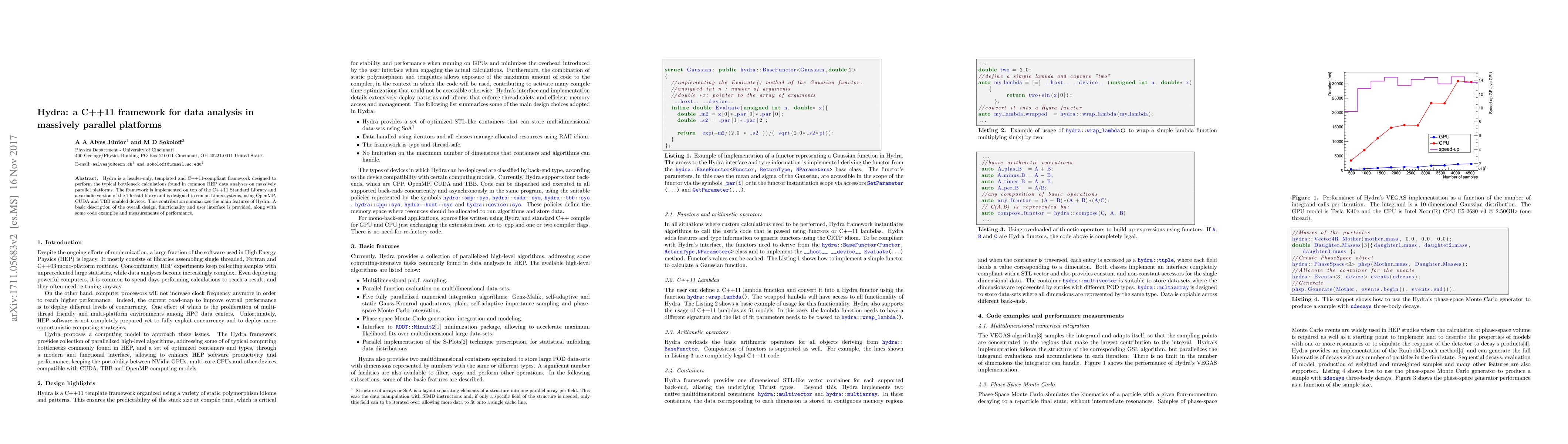 Hydra is a C++11-compliant, header-only framework for data analysis on massively parallel platforms, utilizing OpenMP, CUDA, and TBB. It leverages the C++11 Standard Library and a variadic version of the Thrust library to perform common HEP analysis calculations efficiently.
