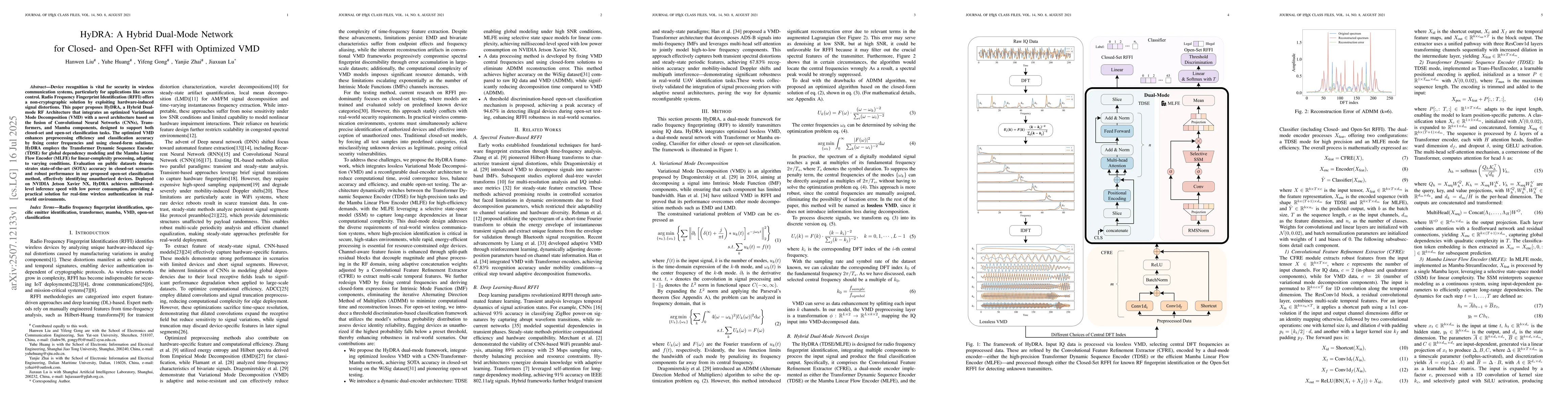 Device recognition is vital for security in wireless communication systems, particularly for applications like access control. Radio Frequency Fingerprint Identification (RFFI) offers a non-cryptographic solution by exploiting hardware-induced signal distortions. This paper proposes HyDRA, a Hybrid Dual-mode RF Architecture that integrates an optimized Variational Mode Decomposition (VMD) with a novel architecture based on the fusion of Convolutional Neural Networks (CNNs), Transformers, and Mamba components, designed to support both closed-set and open-set classification tasks. The optimized VMD enhances preprocessing efficiency and classification accuracy by fixing center frequencies and using closed-form solutions. HyDRA employs the Transformer Dynamic Sequence Encoder (TDSE) for global dependency modeling and the Mamba Linear Flow Encoder (MLFE) for linear-complexity processing, adapting to varying conditions. Evaluation on public datasets demonstrates state-of-the-art (SOTA) accuracy in closed-set scenarios and robust performance in our proposed open-set classification method, effectively identifying unauthorized devices. Deployed on NVIDIA Jetson Xavier NX, HyDRA achieves millisecond-level inference speed with low power consumption, providing a practical solution for real-time wireless authentication in real-world environments.
