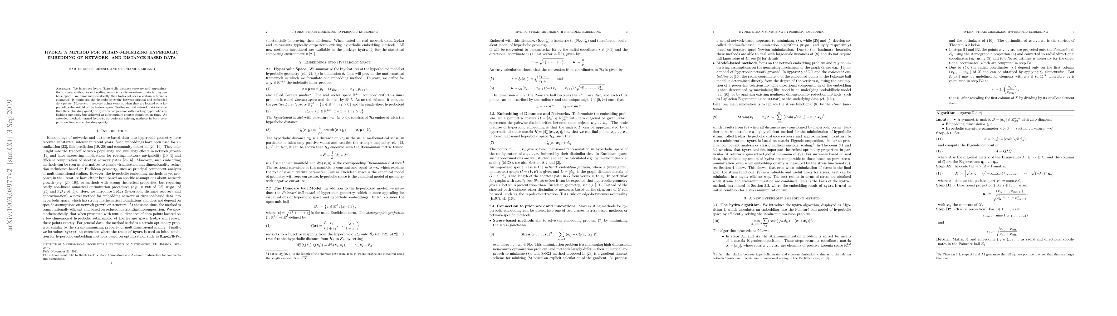 We introduce hydra (hyperbolic distance recovery and approximation), a new method for embedding network- or distance-based data into hyperbolic space. We show mathematically that hydra satisfies a certain optimality guarantee: It minimizes the `hyperbolic strain' between original and embedded data points. Moreover, it recovers points exactly, when they are located on a hyperbolic submanifold of the feature space. Testing on real network data we show that the embedding quality of hydra is competitive with existing hyperbolic embedding methods, but achieved at substantially shorter computation time. An extended method, termed hydra+, outperforms existing methods in both computation time and embedding quality.
