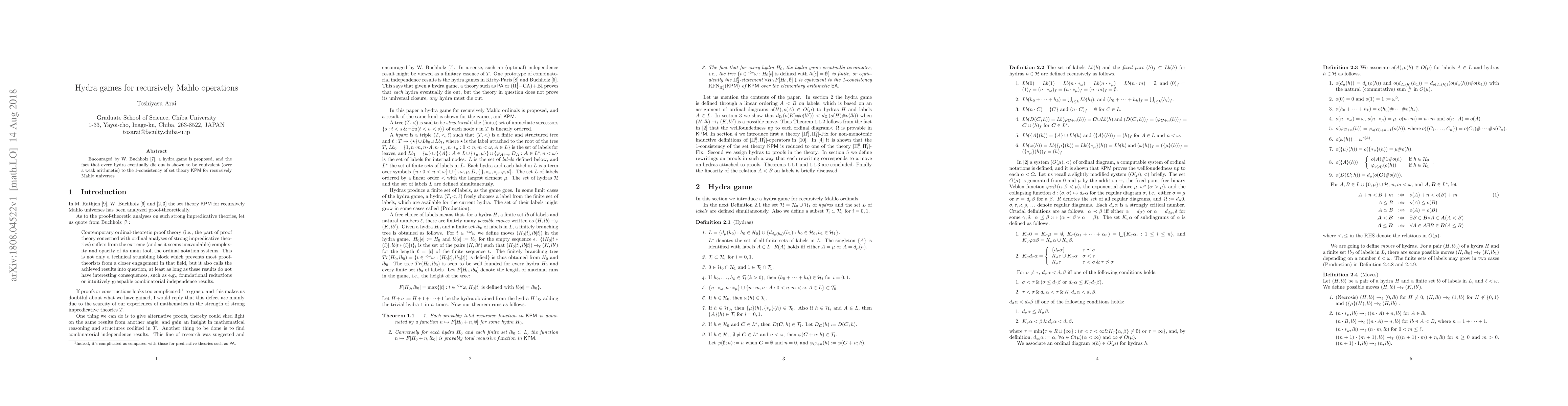 This paper introduces a hydra game to demonstrate that every hydra will eventually die out, which is equivalent to the 1-consistency of set theory KPM for recursively Mahlo universes within a weak arithmetic framework.