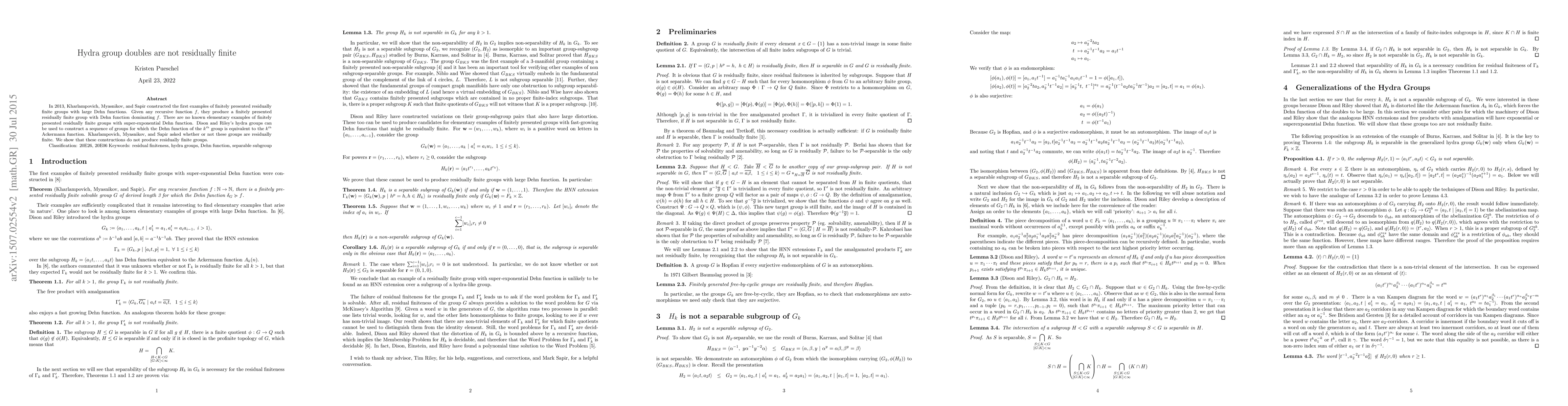 This paper demonstrates that the double of the Hydra group, an example from Dison and Riley, does not result in a residually finite group, answering a question posed by Kharlampovich, Myasnikov, and Sapir regarding the residual finiteness of such groups with super-exponential Dehn functions.