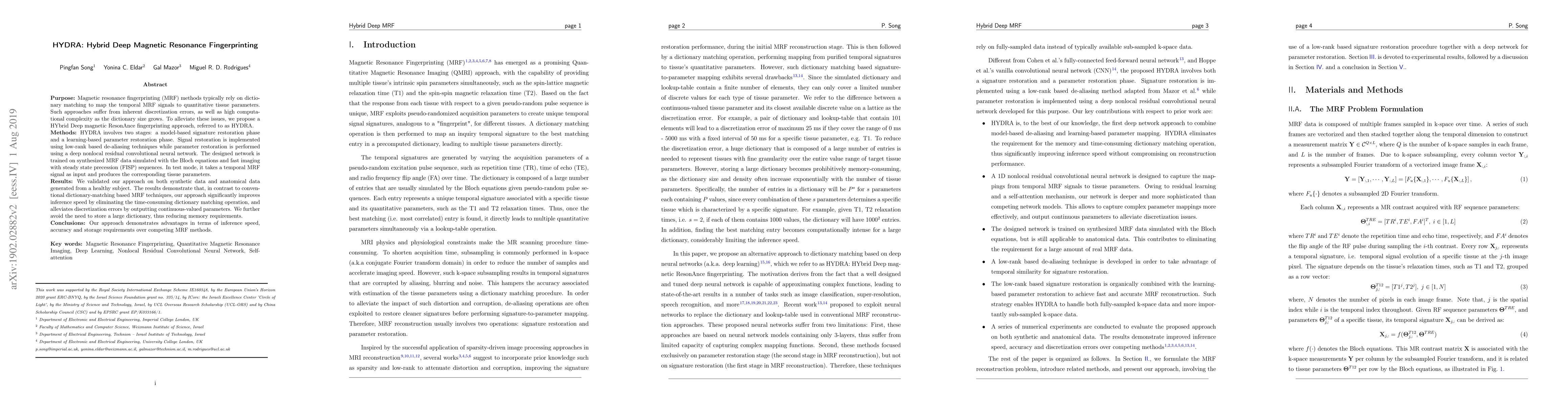 HYDRA is a hybrid deep learning approach for magnetic resonance fingerprinting that combines model-based signal restoration with a deep neural network for parameter estimation, significantly improving inference speed and accuracy while reducing computational and memory demands compared to traditional dictionary-matching methods.