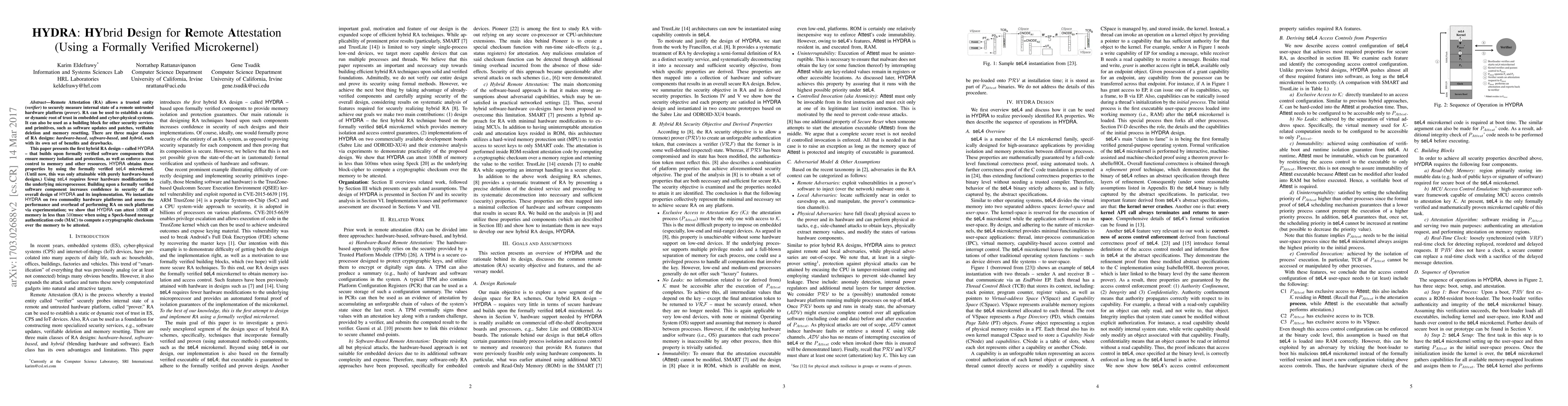 This paper introduces HYDRA, a hybrid remote attestation design leveraging a formally verified seL4 microkernel to achieve memory isolation and protection, reducing hardware modifications. HYDRA demonstrates performance, attesting 10MB of memory in under 500msec using a Speck-based MAC, providing a secure and efficient attestation mechanism for embedded systems.