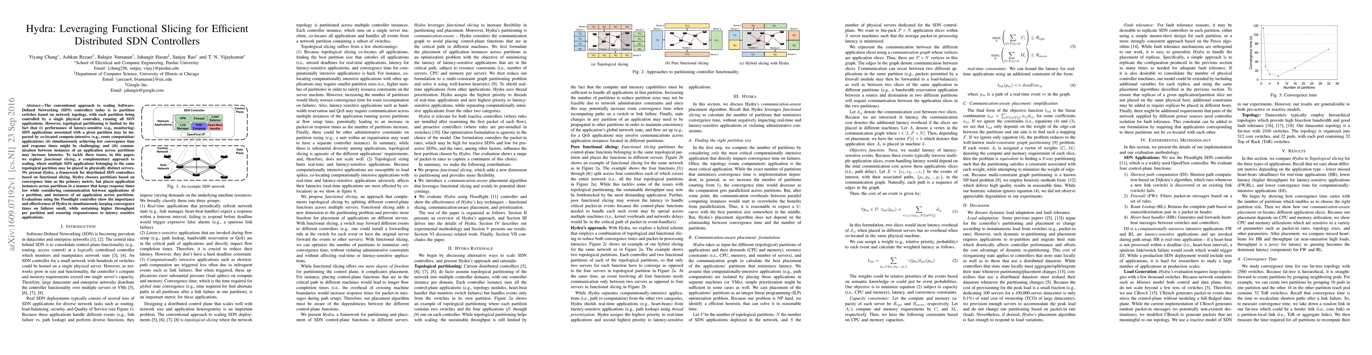 Hydra leverages functional slicing to efficiently scale distributed SDN controllers by placing different SDN applications on separate servers within the same topological partition, thereby reducing latency and improving responsiveness while maintaining low convergence times. Evaluations demonstrate Hydra's effectiveness in balancing throughput and responsiveness for latency-sensitive applications.