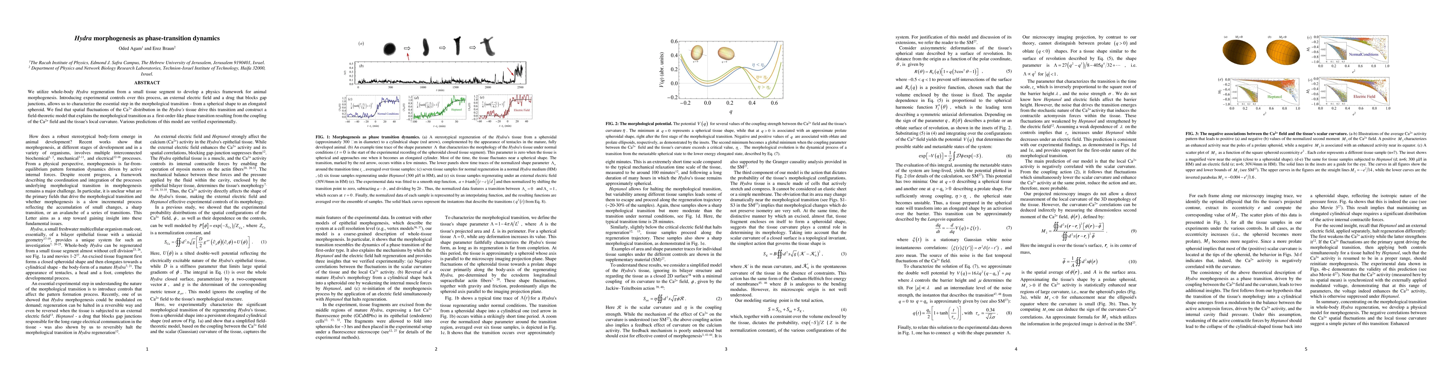 This paper develops a physics framework to describe Hydra morphogenesis, showing that spatial fluctuations in Ca2+ distribution drive the transition from a spherical to an elongated shape. The authors propose a field-theoretic model explaining this as a phase transition, validated by experimental manipulations and controls.