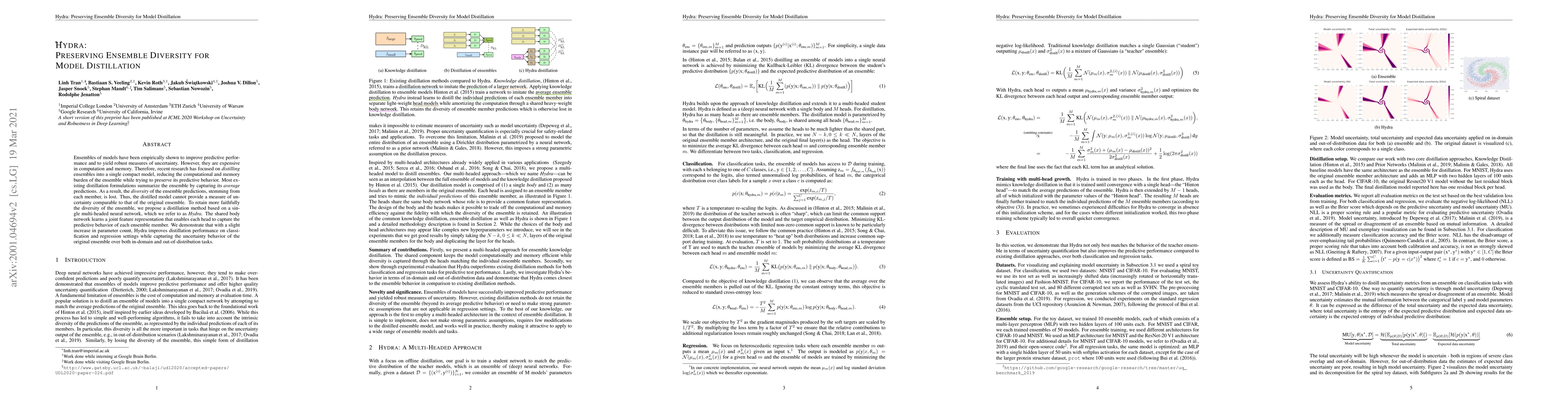 Hydra proposes a distillation method using a multi-headed neural network to preserve the diversity of ensemble models, capturing each member's predictive behavior and uncertainty, thus improving performance while reducing computational costs. The method shows enhanced performance in classification and regression tasks compared to traditional distillation methods.