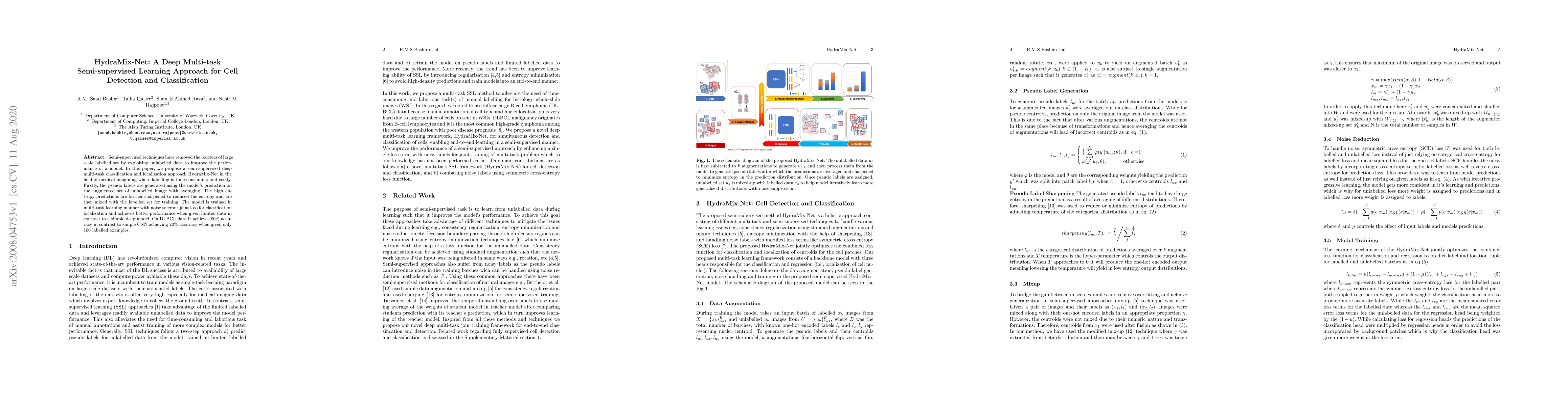 HydraMix-Net is a semi-supervised deep multi-task learning approach for cell detection and classification in medical imaging. It leverages unlabelled data to improve model performance, achieving 80% accuracy on DLBCL data with limited labelled examples, outperforming simple CNNs.