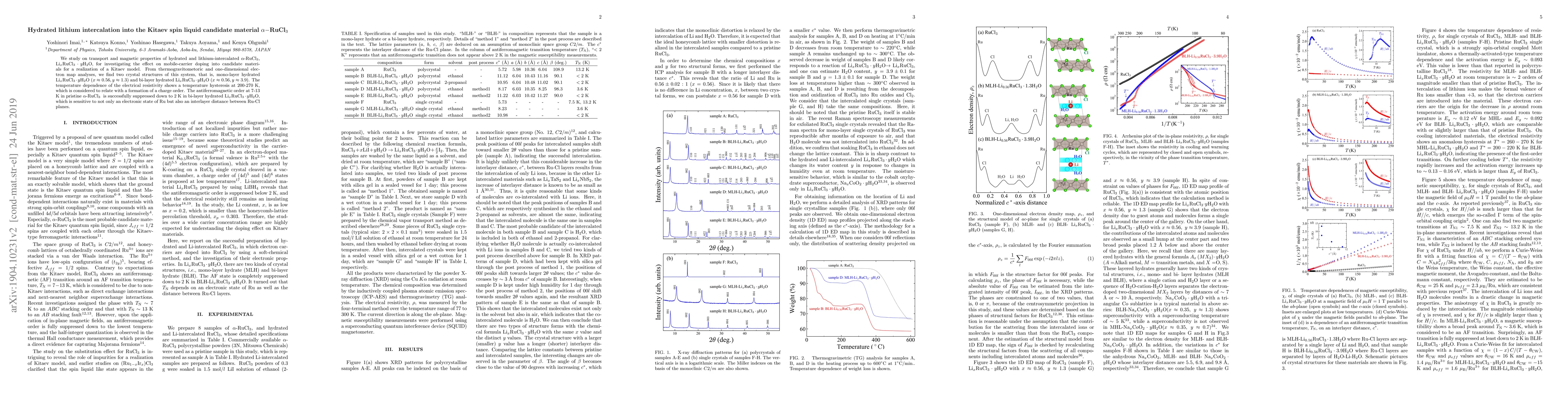 This study investigates the transport and magnetic properties of hydrated lithium-intercalated $\alpha$-RuCl$_3$ (Li$_x$RuCl$_3 \cdot y$H$_2$O), revealing two crystal structures and a temperature-dependent electrical resistivity with hysteresis, indicative of charge order formation. The antiferromagnetic order in pristine $\alpha$-RuCl$_3$ is suppressed in the bi-layer hydrated form, suggesting a significant influence of mobile-carrier doping and interlayer distance on the material's electronic state.